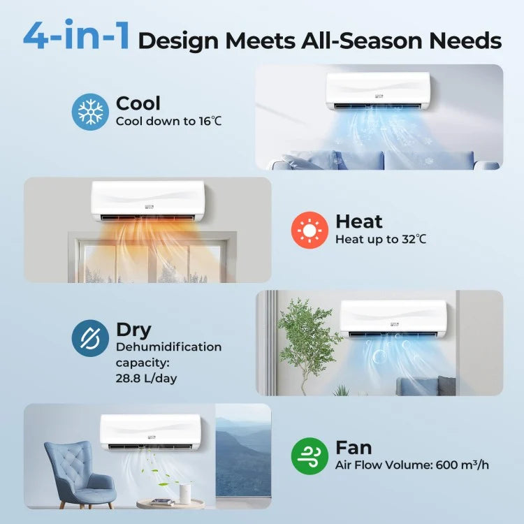 Year-round climate control: 12000 BTU cooling / 12300 BTU heating for spaces up to 750 sq.ft.