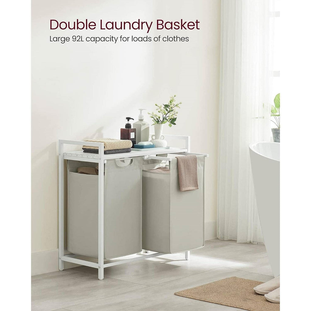Organize your laundry efficiently with our 2-Basket Laundry Hamper Sorter, featuring two Oxford fabric bags to help you separate and sort laundry by color or type. The top storage shelf is perfect for storing laundry detergents, fabric softeners, or bathroom toiletries, keeping them within easy reach. Crafted from sturdy MDF, steel, and Oxford fabric, this laundry sorter ensures durability and reliability.