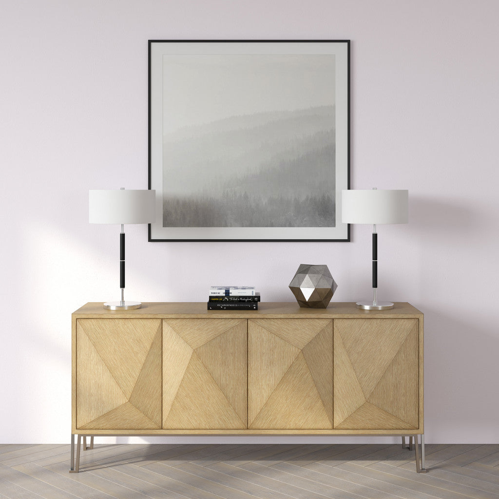- Standard table lamp with a black and silver base and a white fabric shade.