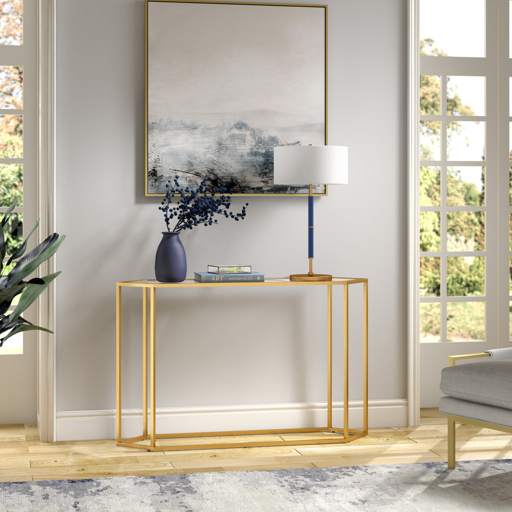 - Blue and gold base color with a white fabric shade for a stylish look.