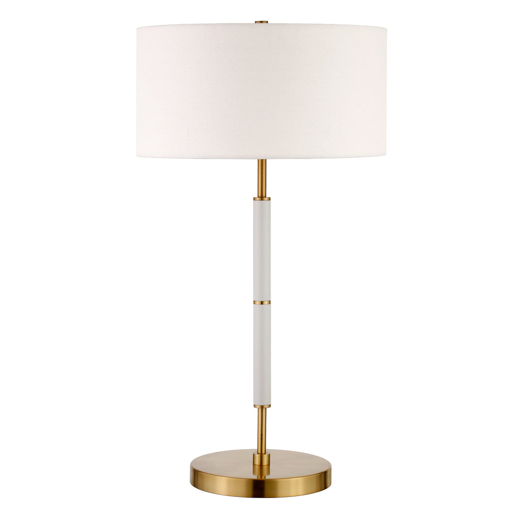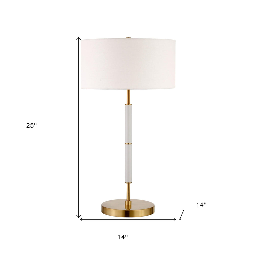 Bring of level of elegance and freshness to your space with this high quality 25-inch gold and white metal two light table lamp with white drum shade. The lamp is made of sturdy metal and features a gold and white color. The white drum fabric shade is finishes this piece off nicely and symmetrically this standard table lamp is designed to provide general lighting to the area. Use this lamp anywhere and elevate the look of the whole space. It is perfect for virtually any decor. 25-inch H x 14-inch W x 14-inch D