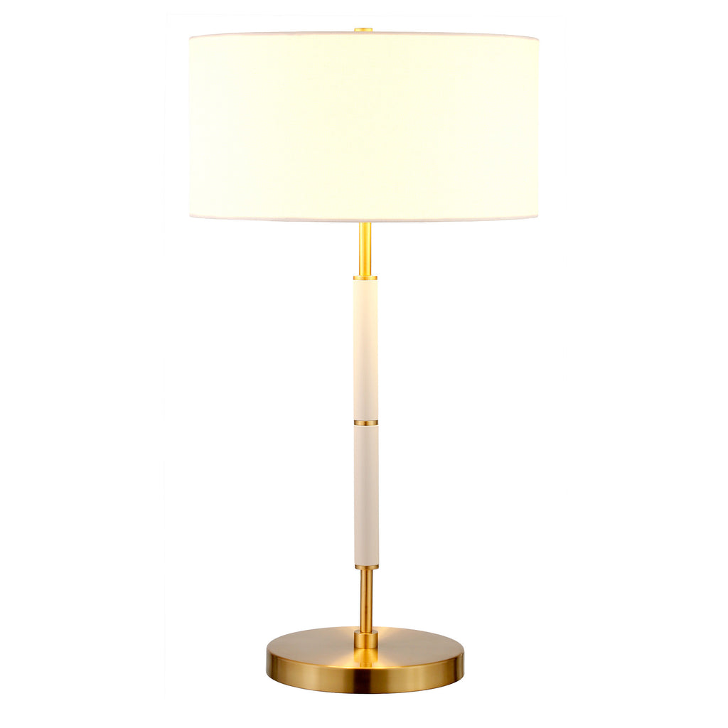 - Gold and white base with a white fabric shade for a stylish and modern look.