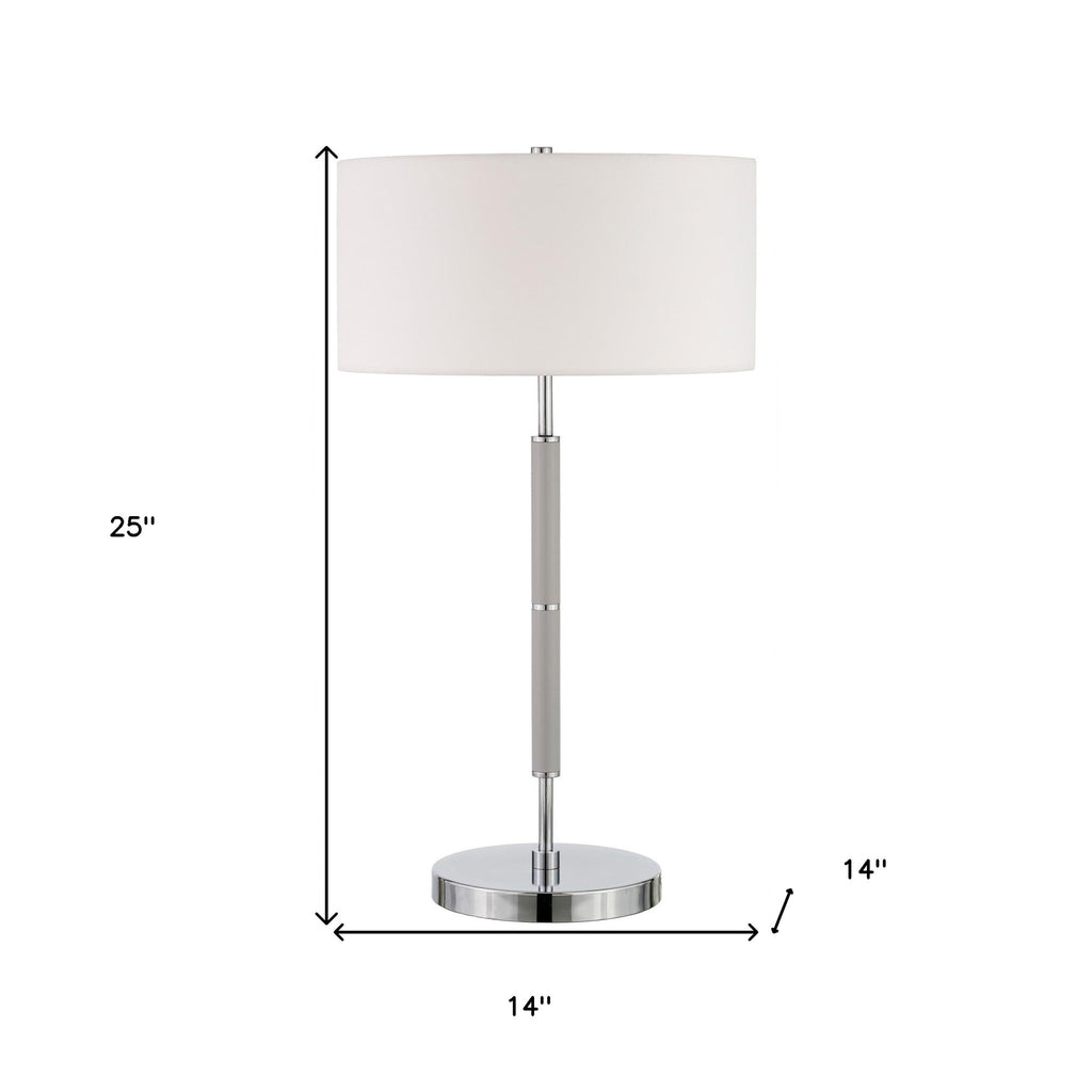 Add a bright anchor to your room with this 25-inch gray metal two light table lamp with white drum shade. The base of this lamp is made of metal finished in a gray tone. Includes a white fabric, drum shaped shade, making this a fashionable piece that will complement most any interior. This standard table lamp is designed to provide general lighting to the area. The light that this lamp throws is soft and warm to elevate the look of most any space in your home. It is perfect for virtually any decor. 25-inch H x 14-inch W x 14-inch D