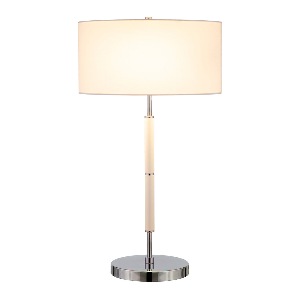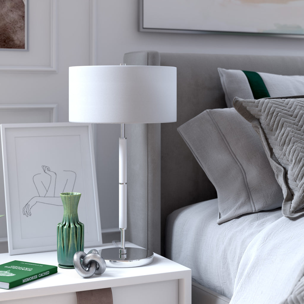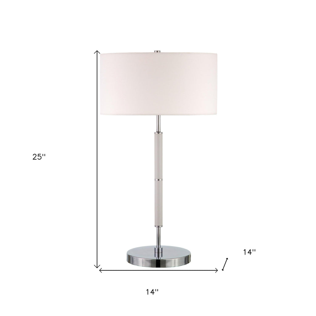 Truly a mix of design and functionality that doesn't compromise on style, this 25-inch white and silver metal two light table lamp with white drum shade will be a great addition to your space. The lamp is made of sturdy metal and features a white and silver color. The white drum fabric shade is finishes this piece off nicely and symmetrically this standard table lamp is designed to provide general lighting to the area. Use this lamp anywhere and elevate the look of the whole space. Bring some lite and good vibes into your space with this updated and stylishly designed lamp. 25-inch H x 14-inch W x 14-inch D