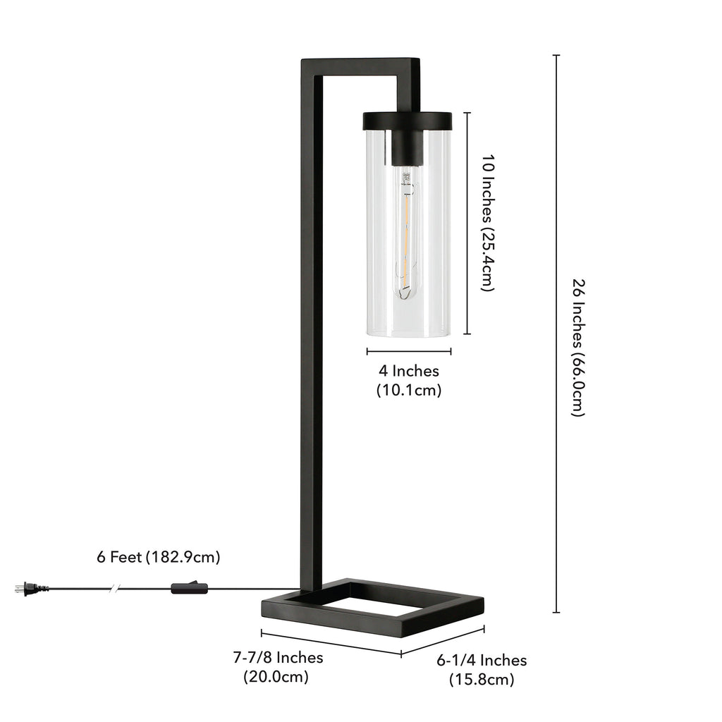 This 26-inch black metal arched table lamp with clear cylinder shade is the perfect combination of design and function. The lamp is made of sturdy metal and features a black color. The clear cylinder glass shade is finishes this piece off nicely and symmetrically a sophisticated take on a classic, this arched table lamp is a great option for a unique look. The light that this lamp throws is soft and warm to elevate the look of most any space in your home. It is perfect for virtually any decor. 26-inch H x 8-inch W x 7-inch D