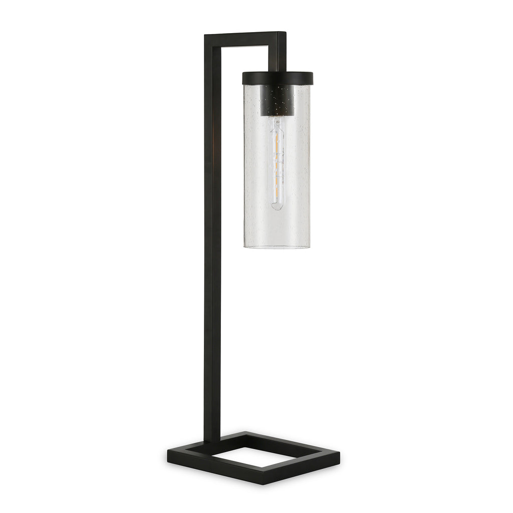 - Modern styled table lamp with a black arched base and a clear glass cylinder shade.