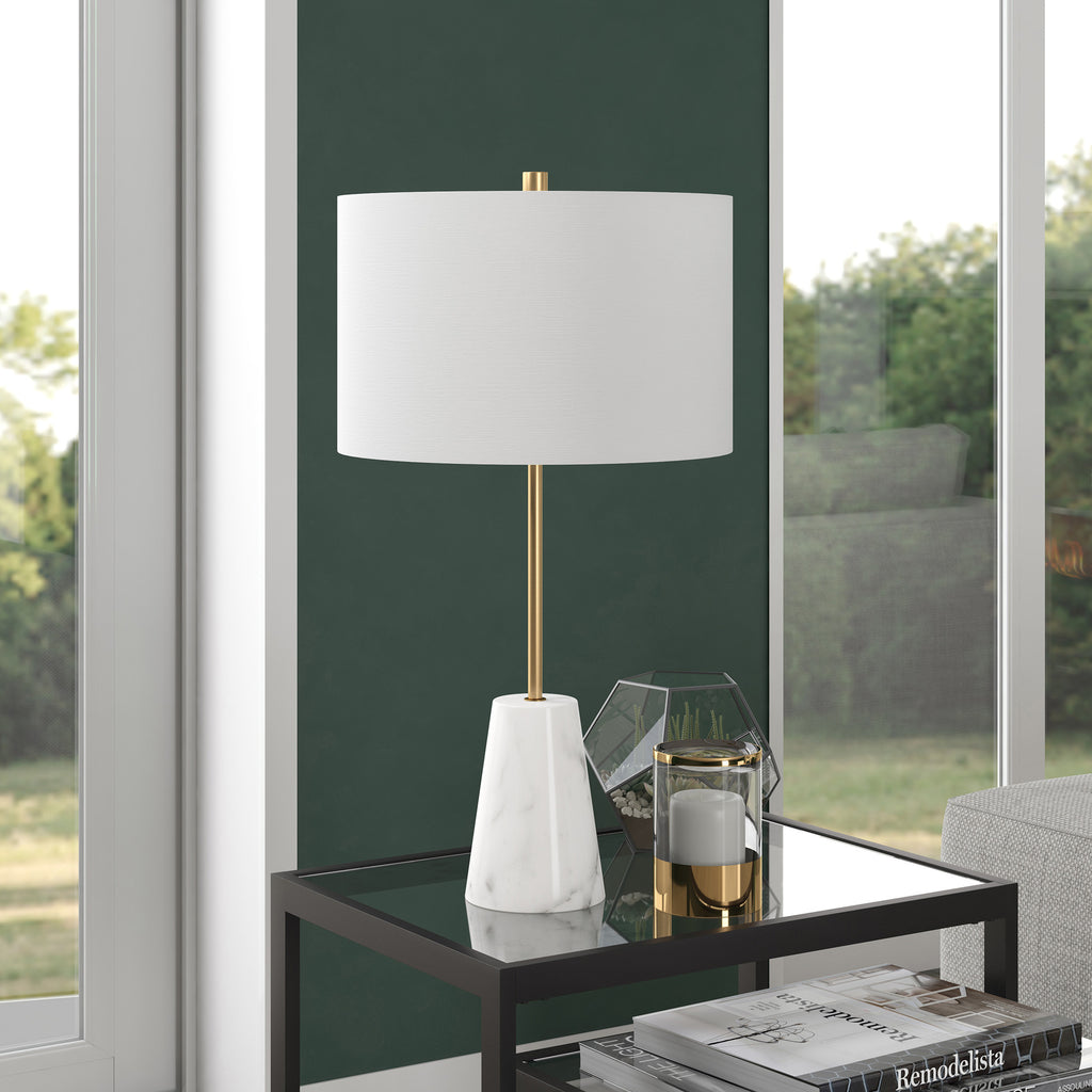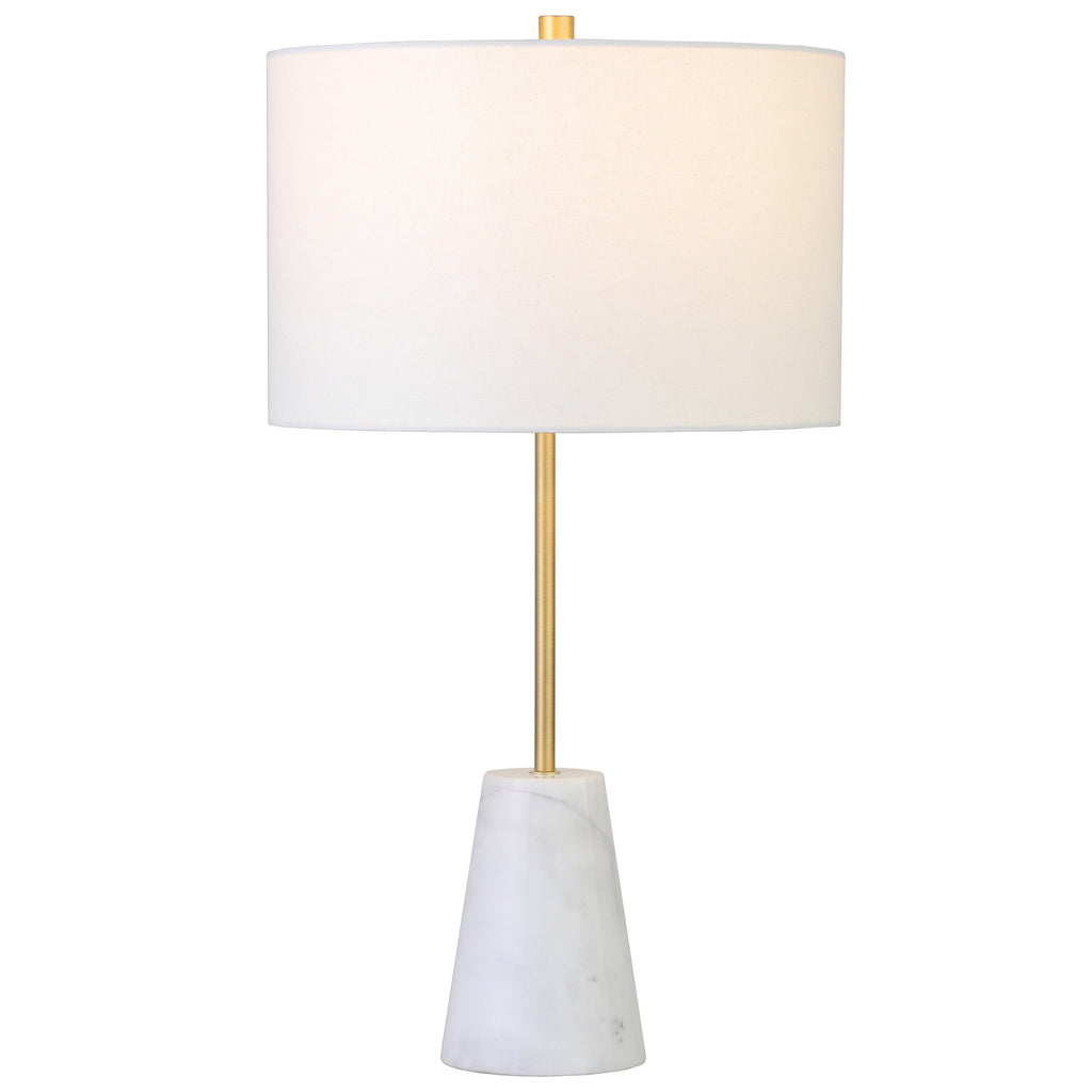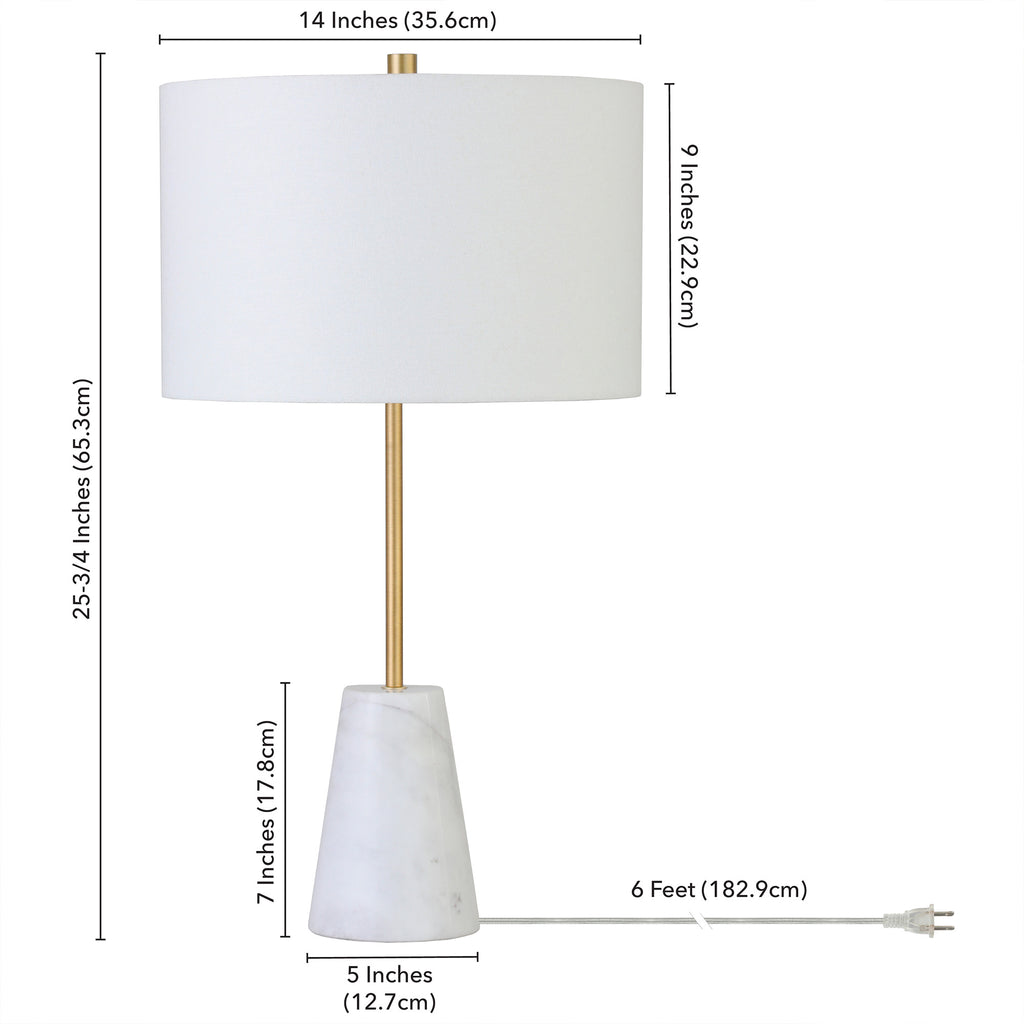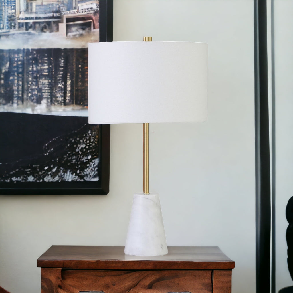 This 26-inch gold and white marble table lamp with white drum shade is a great way to add some brightness to any corner of your home. The base of this lamp is made of marble finished in a gold and white tone. Includes a white fabric, drum shaped shade, making this a fashionable piece that will complement most any interior. This standard table lamp is designed to provide general lighting to the area. Use this lamp anywhere and elevate the look of the whole space. The perfect lamp to create just the right natural and soothing light in your space. 25.5-inch H x 14-inch W x 14-inch D
