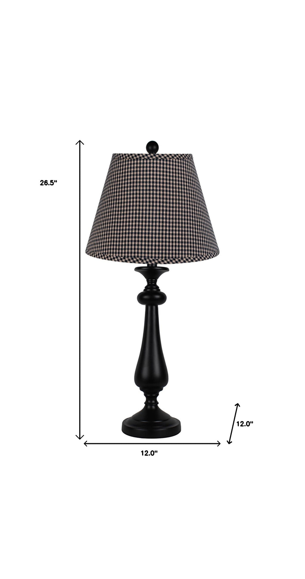 Add a bright anchor to your room with this 27" black candlestick table lamp with black and tan mini check shade. The lamp is made of sturdy resin and features a black color that gives a classic country vibe when mixed with this mini check shade. This standard table lamp is designed to provide general lighting to the area. Use this lamp anywhere and elevate the look of the whole space. It is perfect for virtually any decor. 26.5" H x 12" W x 12" D