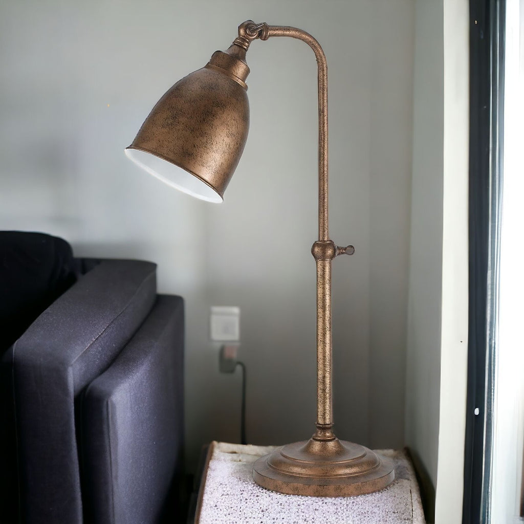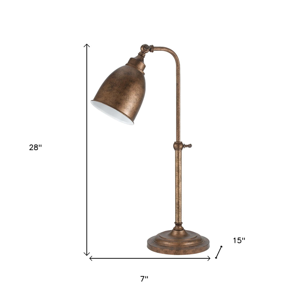 This 28-inch bronze metal adjustable lantern table lamp with bronze dome shade is a great way to add some brightness to any corner of your home. The base of this lamp is made of bronze metal. Includes a bronze metal, dome shaped shade, making this a fashionable piece that will complement most any interior. This pharmacy style desk lamp is designed to provide task lighting and is customizable with the adjustable neck and arm. The light that this lamp throws is soft and warm to elevate the look of most any space in your home. 28-inch H x 7-inch W x 15-inch D