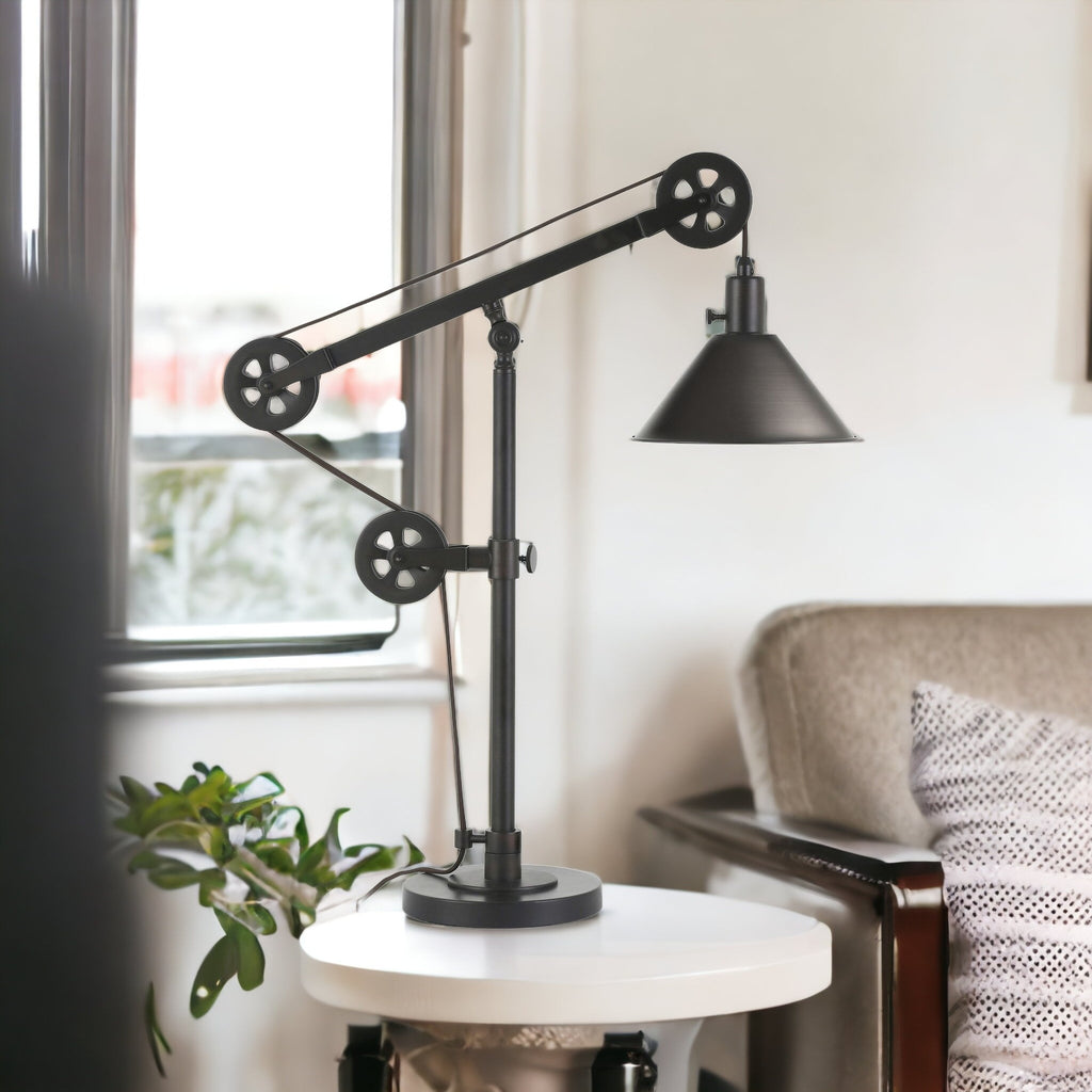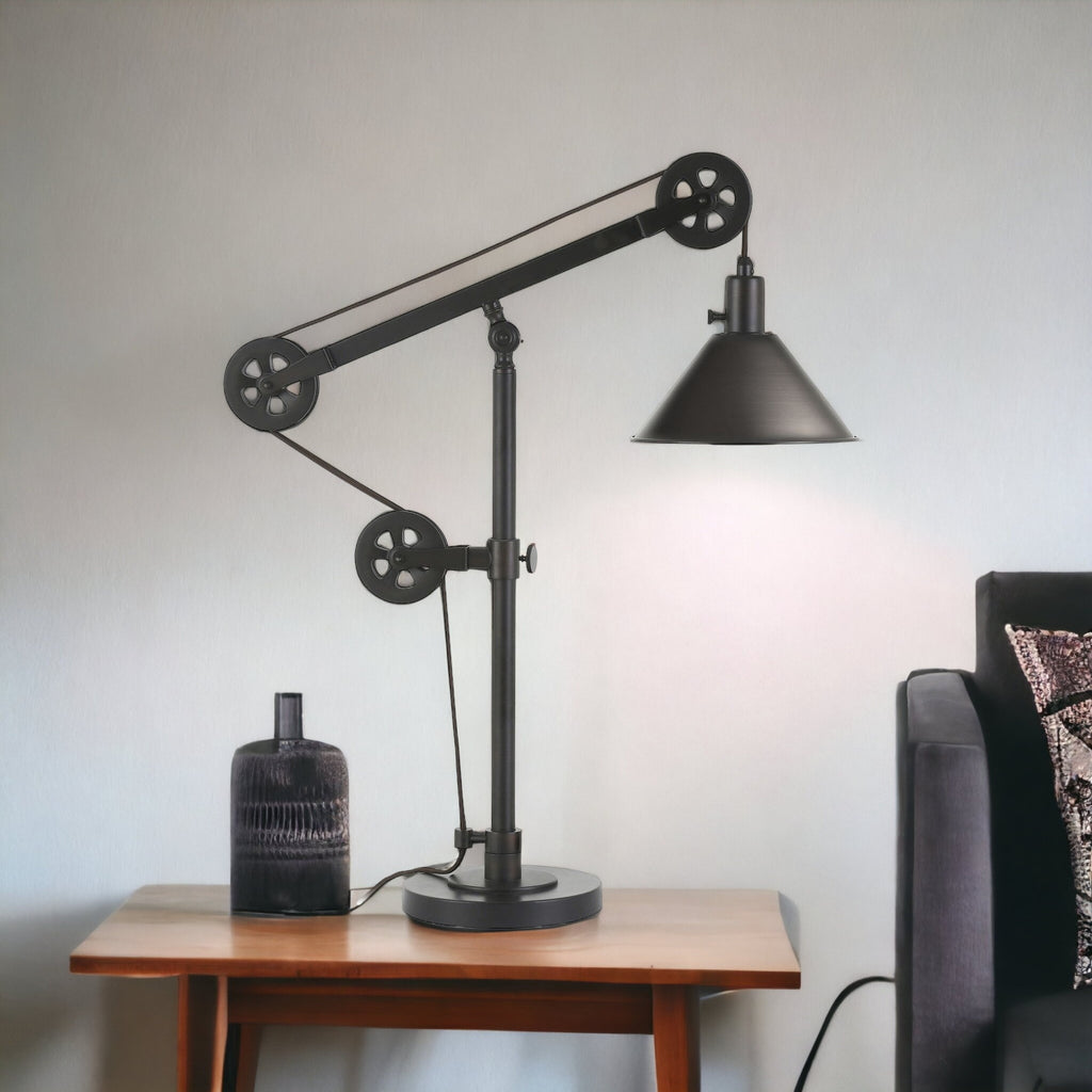 Bring of level of elegance and freshness to your space with this high quality 29-inch black metal desk table lamp with black cone shade. The base of this lamp is made of black metal. The black cone metal shade is finishes this piece off nicely and symmetrically this desk lamp provides 'task lighting' that will illuminate your working area for reading or writing. The light that this lamp throws is soft and warm to elevate the look of most any space in your home. It is perfect for virtually any decor. 29-inch H x 29-inch W x 8-inch D