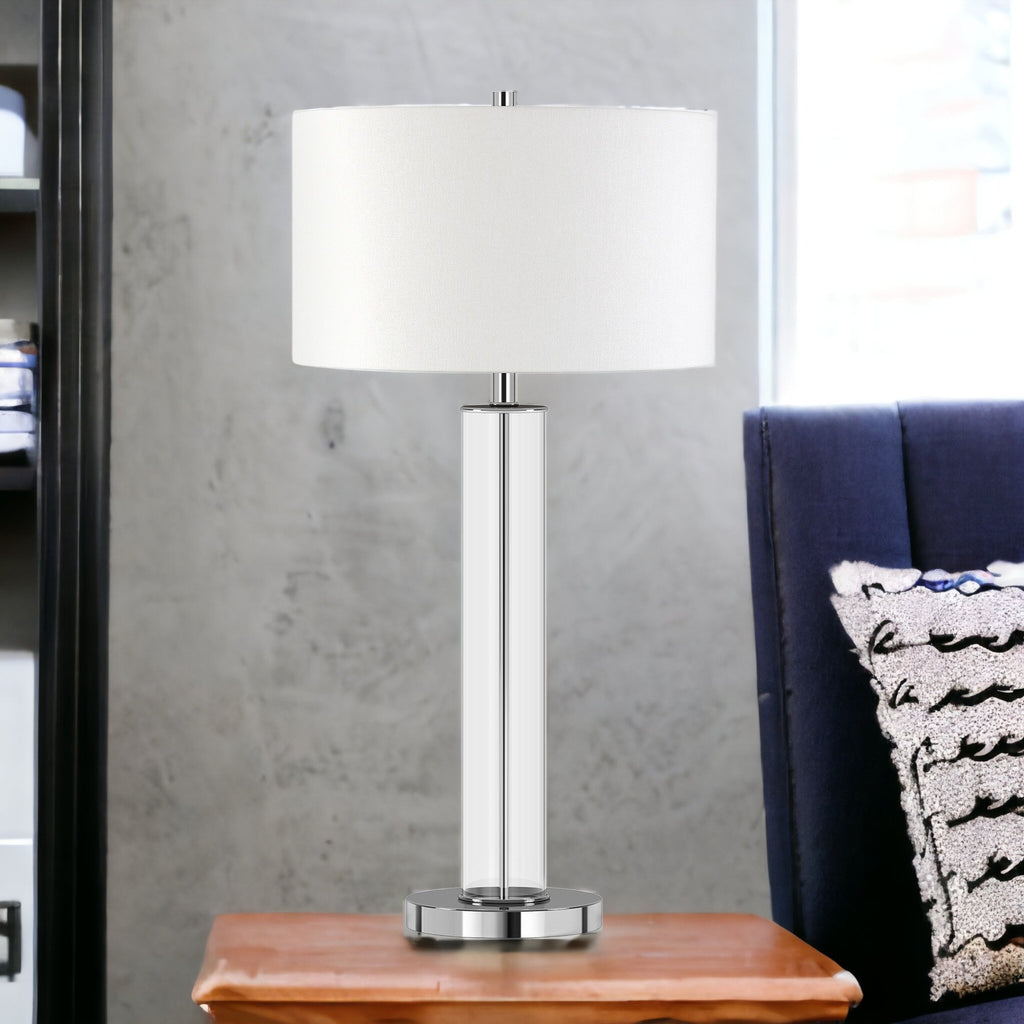 Add a bright anchor to your room with this 29-inch nickel glass table lamp with white drum shade. The lamp is made of sturdy glass and features a nickel color. The white drum fabric shade is a great compliment to this lamp. This standard table lamp is designed to provide general lighting to the area. High quality design makes this a great lamp for not only lighting, but accenting a room with style. Bring some lite and good vibes into your space with this updated and stylishly designed lamp. 29-inch H x 15-inch W x 15-inch D
