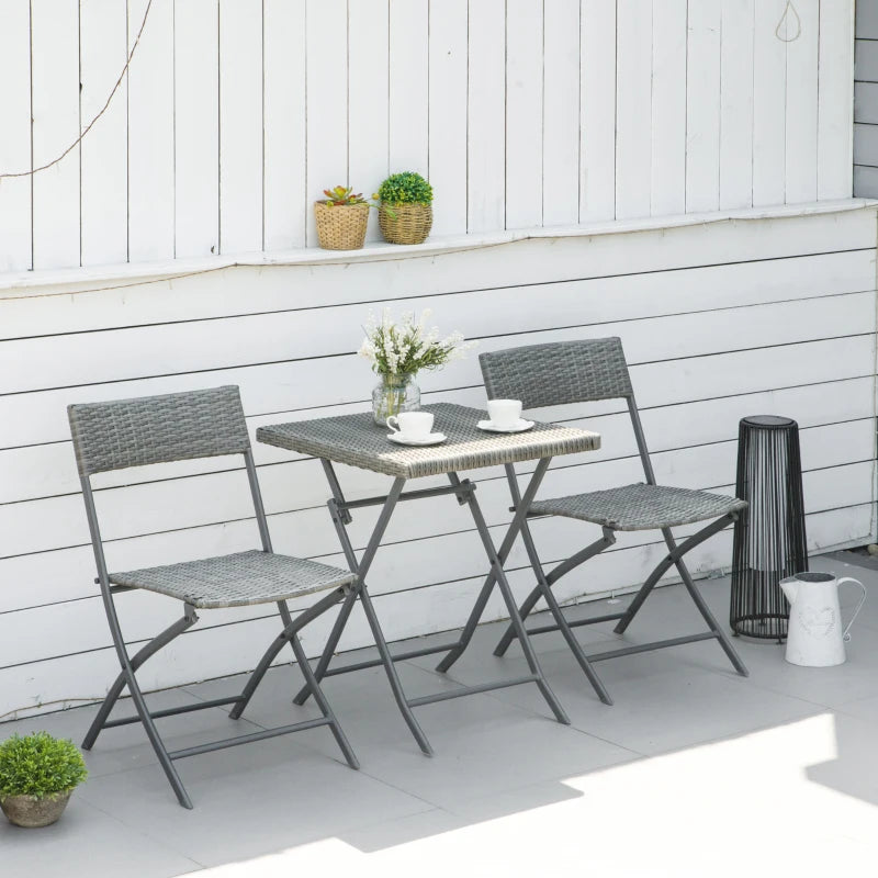 Enjoy outdoor relaxation with this 3-piece rattan patio set, including two chairs and a matching table. Chairs provide comfortable seating, while the table holds drinks, books, or snacks within easy reach. The foldable design saves space and makes storage or transport effortless. Crafted with a solid steel frame and weather-resistant PE rattan, this bistro set combines durability with stylish outdoor charm, perfect for patios, balconies, or gardens.