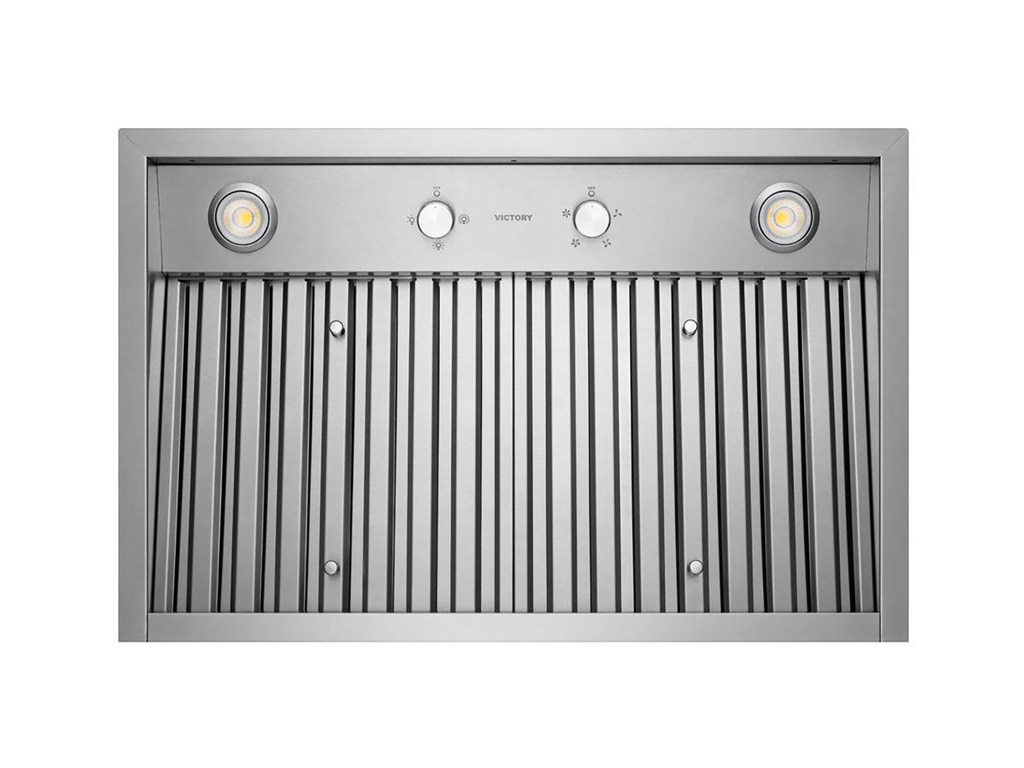 The VICTORY Q5 30-inch range hood insert is designed and assembled in Canada, combining high-quality construction with superior performance. Equipped with durable mechanical switches, an all-metal 750 CFM blower, and stainless steel filters, this hood efficiently removes smoke, odors, and grease while remaining easy to clean and maintain. Compatible with standard 6" or 8" round ducts, it delivers enhanced airflow with quieter operation. Its impressive 19-inch depth provides optimal coverage over your cooktop, protecting cabinets from discoloration. Warm dimmable LED lights ensure excellent visibility while cooking, making the Q5 a top choice for high-performance kitchen ventilation.