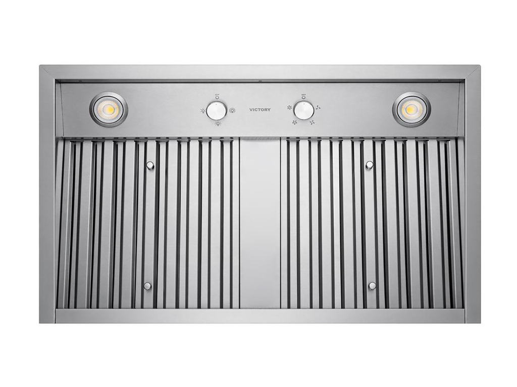 The VICTORY Q5 36-inch range hood insert is designed and assembled in Canada, combining superior craftsmanship with high-performance ventilation. Equipped with durable mechanical switches, an all-metal blower, and stainless steel filters, it efficiently removes smoke, odors, and grease while remaining easy to clean. Compatible with 6" or 8" round ducts for improved airflow and quieter operation, this hood insert ensures optimal performance. Its impressive 19-inch depth provides excellent coverage over your cooktop, preventing smoke and odors from affecting your cabinets. Warm dimmable LED lights offer clear visibility while cooking, making the Q5 a reliable, efficient, and stylish choice for any kitchen.