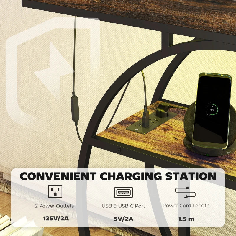 Power up and elevate your space with this multi-functional console table. Equipped with USB, USB-C, and standard power outlets, you can charge multiple devices simultaneously without messy cords. The built-in RGB LED lights offer over 60,000 colors and 29 dynamic modes, syncing to music and ambient sounds for a lively, customizable atmosphere. Four staggered shelves provide ample display and storage space, while the industrial O-shaped metal frame with rustic brown shelves adds a stylish focal point to your hallway, living room, or entryway.