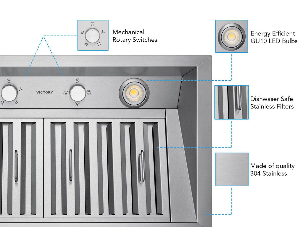 The VICTORY Q2 42-inch range hood insert is designed and assembled in Canada, delivering professional-grade performance with a sleek, slim design. Equipped with high-quality mechanical switches, an all-metal blower, and stainless steel filters, it efficiently removes smoke, odors, and grease while remaining easy to use and clean. Compatible with standard 6" or 8" round ducts, it ensures optimal airflow and quieter operation. Bright, warm dimmable LED lights provide excellent cooktop visibility, while the 15-inch depth offers better coverage over your cooking surface. Perfect for custom cabinet installations, the Q2 combines reliability, efficiency, and style for any modern kitchen.