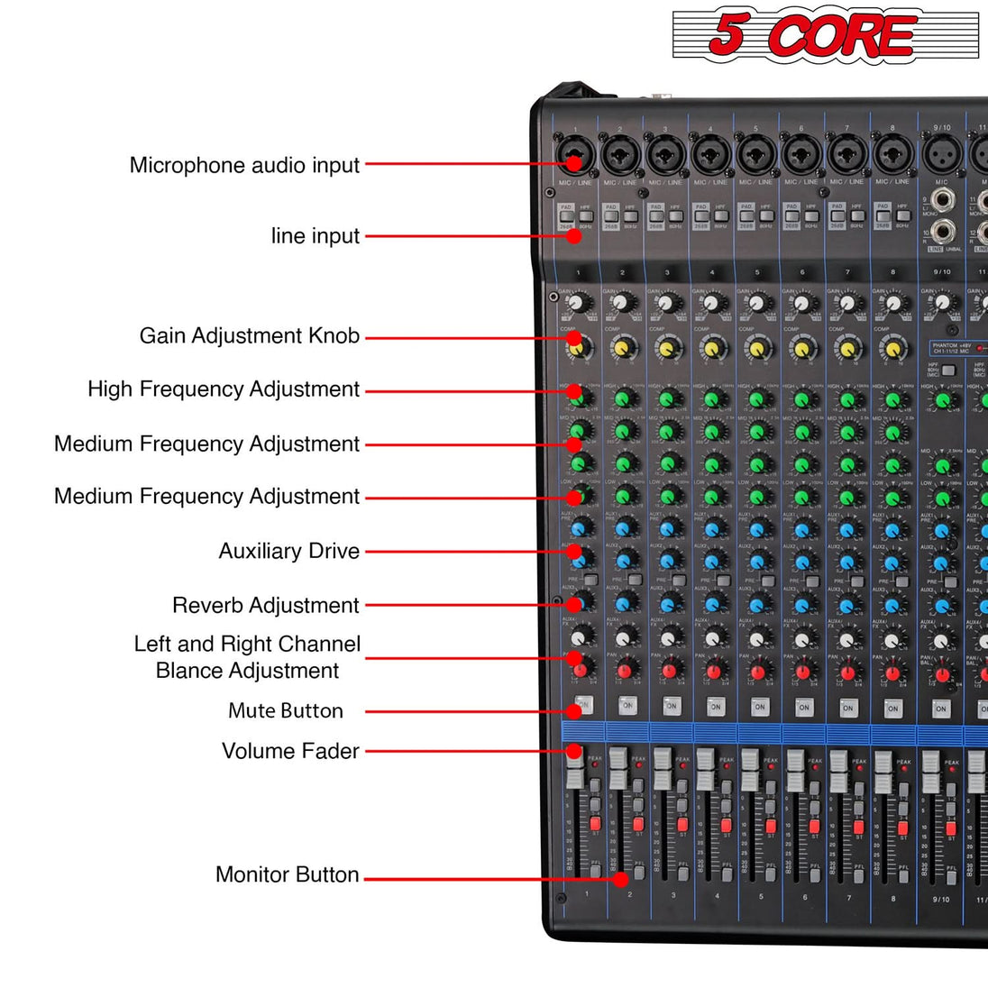 Accurate Vocal Adjustment : Each channel of the DJ mixing console is equipped with Gain, FX, and PAN control knobs, along with High/Mid/ Low 3- Band EQ, peak LED indicator, Mute Button, PFL button, and level control faders for precise vocal adjustment.