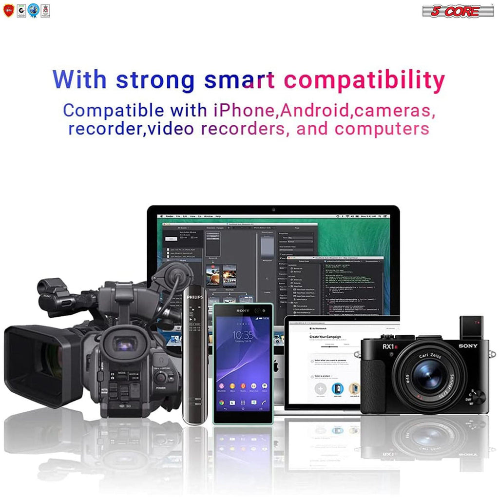 UNIVERSAL COMPATIBILITY - 3.5 jack & 1/4" adapter let you connect smartphones, cameras, audio recorders, and PC.
