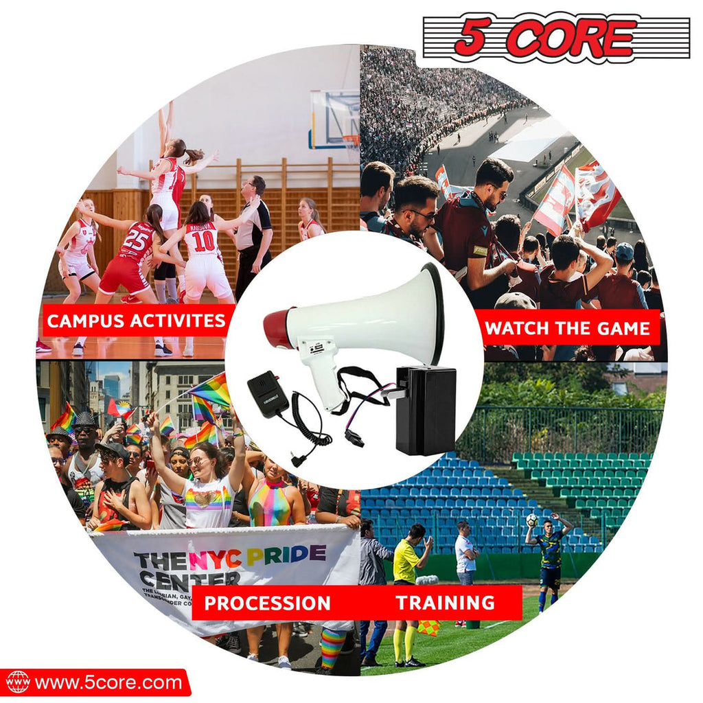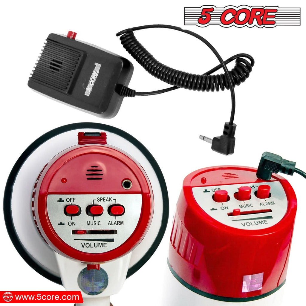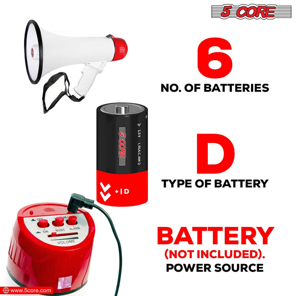 5 Core professional megaphone, designed to make your voice heard with clarity and precision! Available in sleek white and red color, it delivers a robust 40W of power, ensuring your message carries across any crowd. Easily adjust the volume to suit your needs and record up to 16 seconds of your speech for repeated playback. Activate the alarm/siren mode for emergencies or attention grabbing situations. The detachable mic in the portable megaphone bullhorn loud speaker offers versatility in sound projection. With an impressive 1000 yard voice projection range, powered by 6 type D batteries (not included), this powerful mega phone is your ultimate communication tool for any event or occasion. |