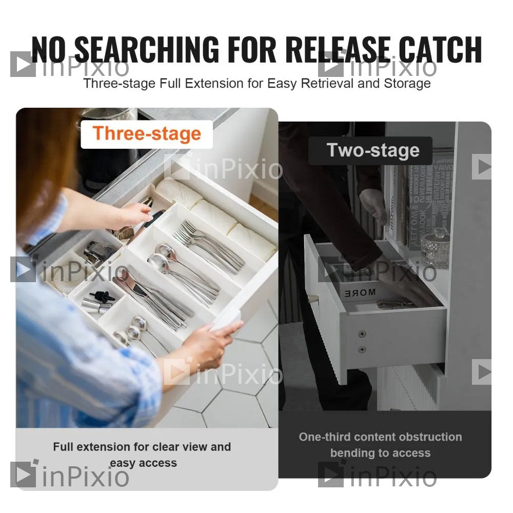 - Three-Stage Full Extension: No more searching and digging! Our three-stage full extension drawer design makes it easy to see and access your items. Compared to two-stage designs, it eliminates blind spots and makes operation more convenient.