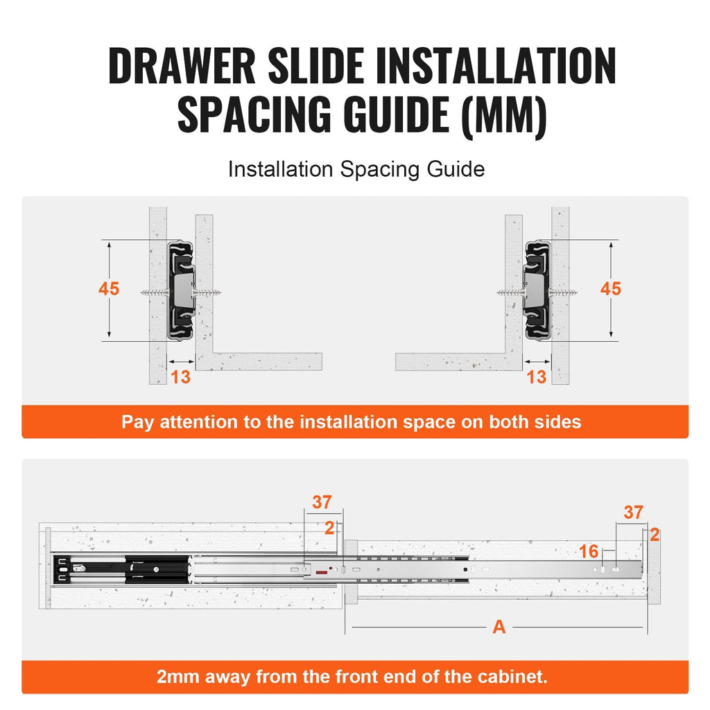 - Installation Guidance: Our side-mount drawer slides are designed to address installation pain points. Specially designed installation spacing guidance places the slides 2mm from the front end of the cabinet, making the installation process easier and avoiding unnecessary hassles.