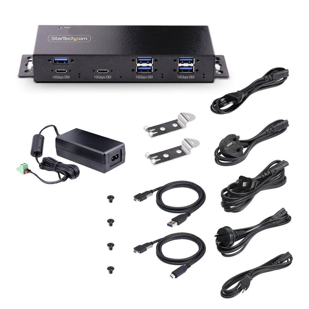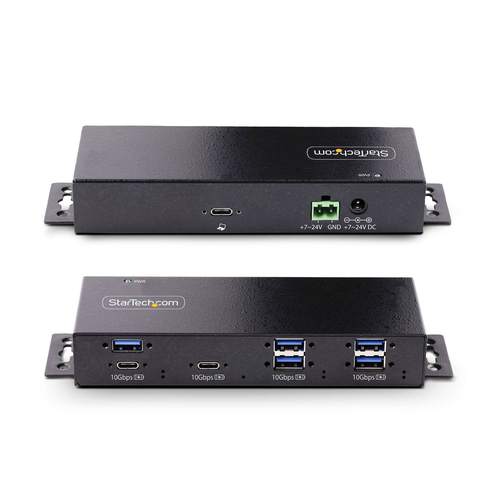 Built for rugged performance and reliable expansion, this 7-Port Industrial USB 10Gbps Hub features 5 USB-A and 2 USB-C downstream ports with full USB 3.2 Gen 2 (10Gbps) support. Housed in a durable metal chassis, this hub is mountable and ideal for demanding environments such as industrial control systems, IT workstations, labs, and automation setups. It includes ESD protection, overcurrent safeguards, and a dedicated power adapter to ensure stable performance for connected high-power USB devices. TAA compliant for use in government and enterprise sectors.