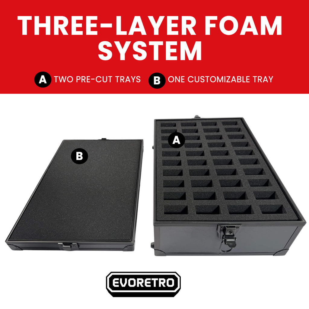 Foam System: Two pre-cut trays for 25–28mm figures plus one customizable foam tray for larger or unique models