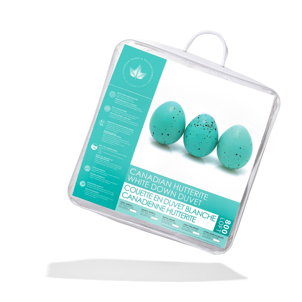 The 800 Loft Hutterite White Down Duvet is crafted in Canada using premium Canadian duck down. Its 500 thread count cotton shell is soft, quiet, and breathable, while the high-loft 800 fill provides exceptional warmth without added weight. Filled with tiny, fluffy clusters of Hutterite duck down from Alberta, this duvet offers luxurious comfort and insulation. Ideal for all-season use, it comes in Regular Weight for warmer sleepers or All Season Weight for cooler bedrooms. The duvet combines quality craftsmanship, hypoallergenic treatment, and RDS certification for a long-lasting and safe bedding experience.
