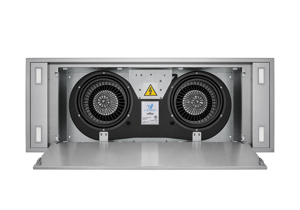 Upgrade your kitchen ventilation with the VICTORY Horizon 900 CFM flush ceiling mount range hood. Designed and assembled in Canada, this innovative hood seamlessly integrates into open-concept kitchens without the need for reframing. Its sleek, minimalist design enhances any modern kitchen while providing professional-grade performance. Equipped with a powerful 900 CFM blower, the Horizon efficiently removes smoke, odors, and grease, ensuring a clean and fresh cooking environment. Ideal for contemporary kitchens, this ceiling mount range hood combines style, functionality, and unmatched ventilation power.