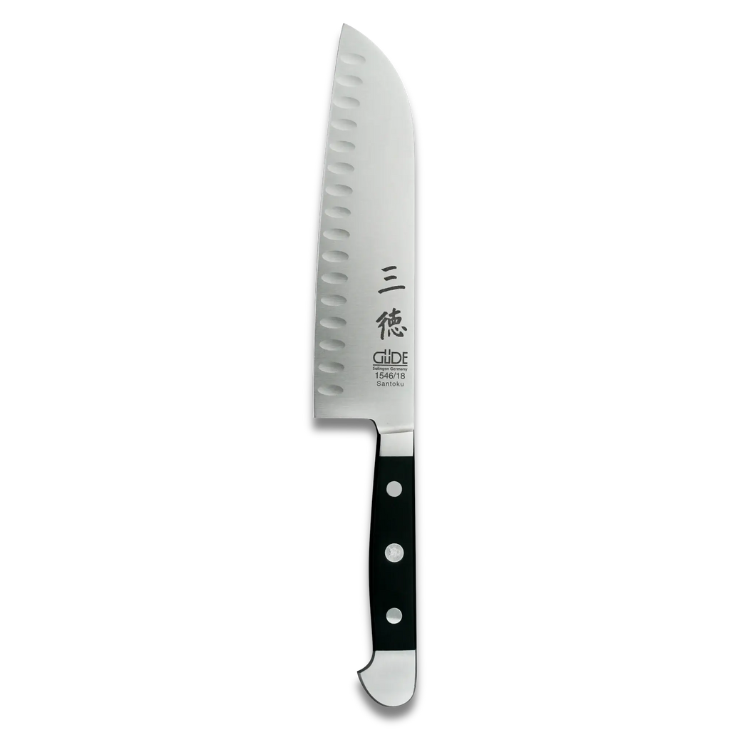 The Alpha Santoku Knife from GÜDE Solingen is a versatile, all-purpose Japanese-style knife designed for precision and efficiency in the kitchen. Its slightly wider, straighter blade with a gently rounded tip distinguishes it from the traditional European chef’s knife, making it ideal for chopping, slicing, and dicing with the Asian-style cutting technique. Perfect for both professional chefs and home cooks seeking a reliable, high-quality knife for everyday tasks.