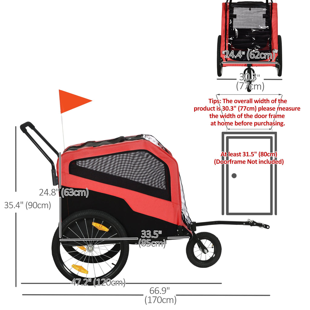 This 2-in-1 Dog Stroller and Bike Trailer offers the ultimate convenience and comfort for both pets and owners. Designed to accommodate large dogs up to 66 lbs (30 kg) and 23.6" (60 cm) in length, it functions as both a stroller for walking and a bike trailer for cycling excursions. The trailer features easy access with zippered front and rear doors and a foot support for stability. It provides excellent ventilation with mesh windows and a sunroof, giving your pet plenty of room to enjoy the scenery. A plastic cover on the front door can be rolled down for added protection during inclement weather. Safety is a priority with a built-in safety leash and visibility reflectors. The solid steel frame with Oxford fabric ensures durability, and the quick-release wheels make it simple to store and transport.