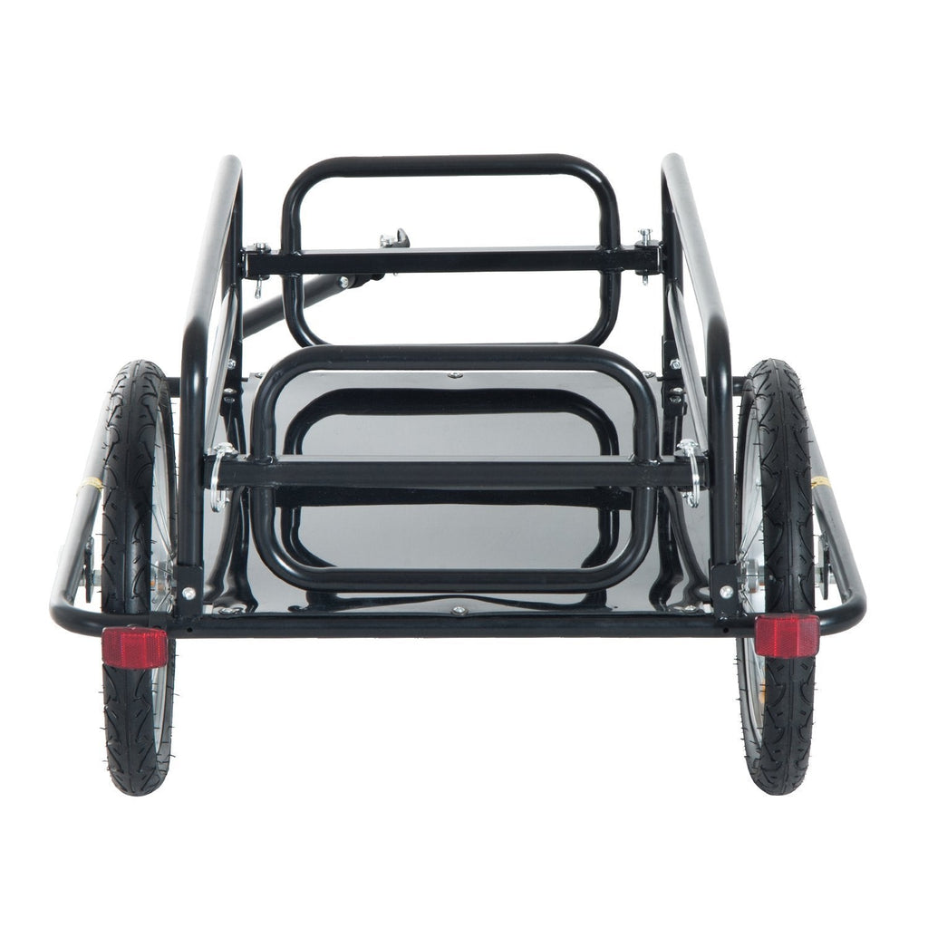 This versatile and durable bicycle cargo trailer is perfect for running errands, grocery shopping, or any hauling task. It attaches easily to most bicycles, providing ample space for your essentials. With a sturdy steel frame, this trailer can support up to 110lbs, making it ideal for transporting heavier loads. The large 16" wheels provide smooth handling, while the two yellow reflectors on each wheel enhance safety and visibility, especially in low-light conditions. Easy to assemble and fold down for convenient storage, this trailer also includes a bicycle hitch for quick attachment.