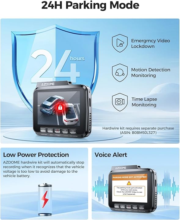 24-hour Parking Monitoring: Connect to optional hardwire kit for time-lapse recording and continuous monitoring