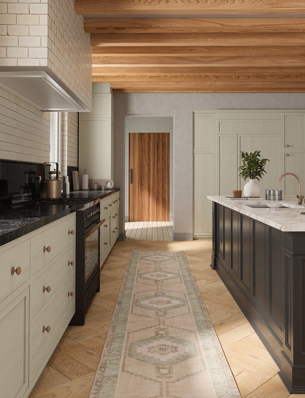 - Persian-inspired design in light green and beige