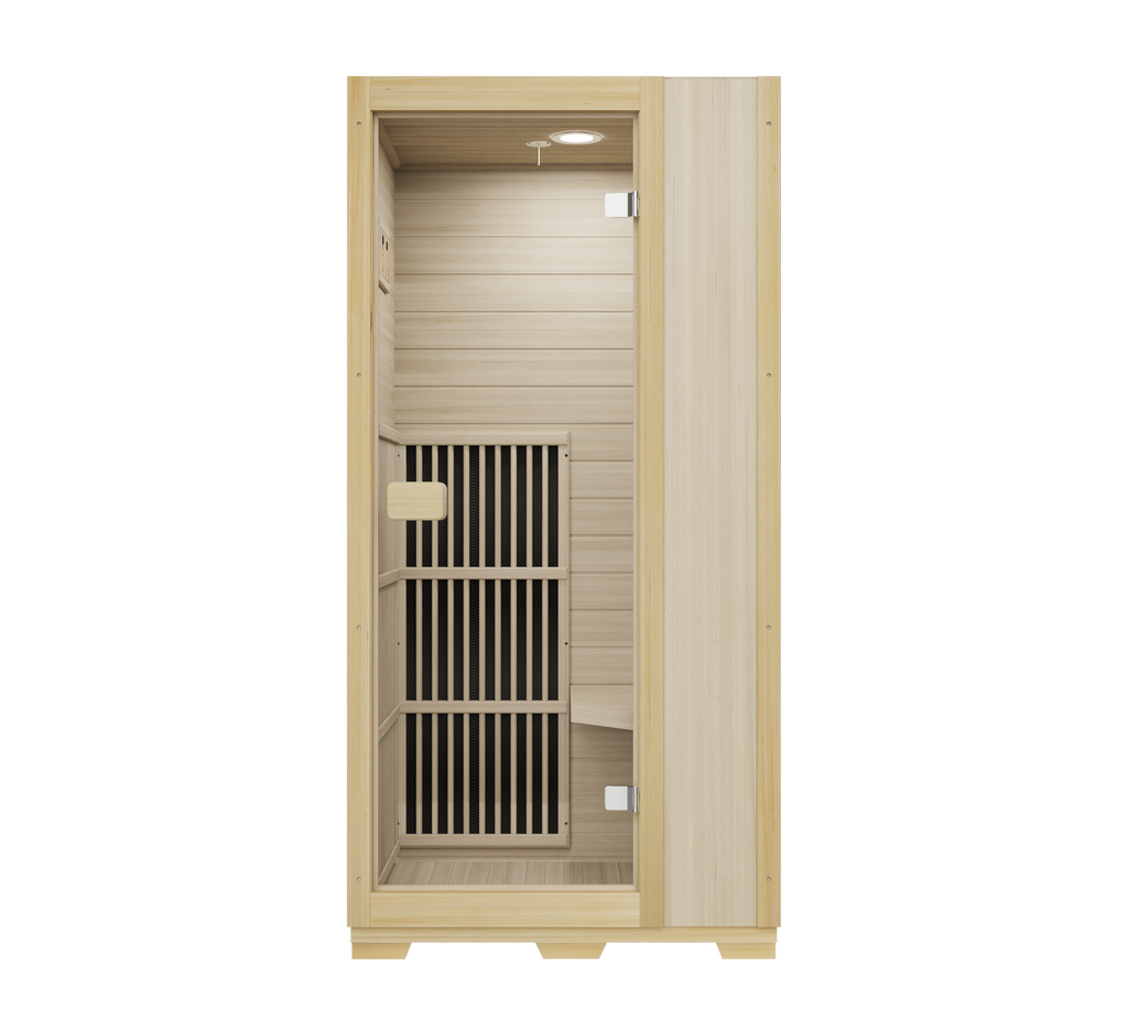 Constructed from responsibly sourced Canadian Hemlock wood with melamine color panels, tempered glass, and carbon fiber far-infrared heating panels, this sauna combines elegance, safety, and energy efficiency. Its compact design allows easy installation in small homes while providing all the benefits of far infrared therapy, including improved skin tone, detoxification, cardiovascular support, pain relief, and enhanced blood circulation. Certified low EMF ensures a safe and healthy sauna experience.