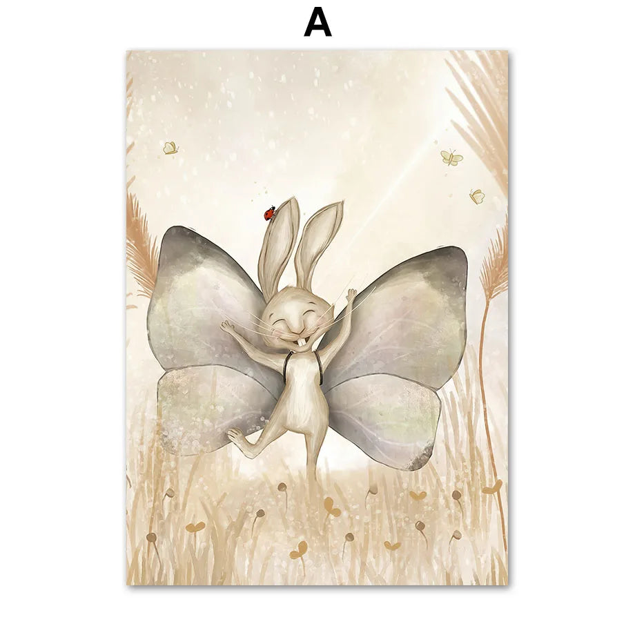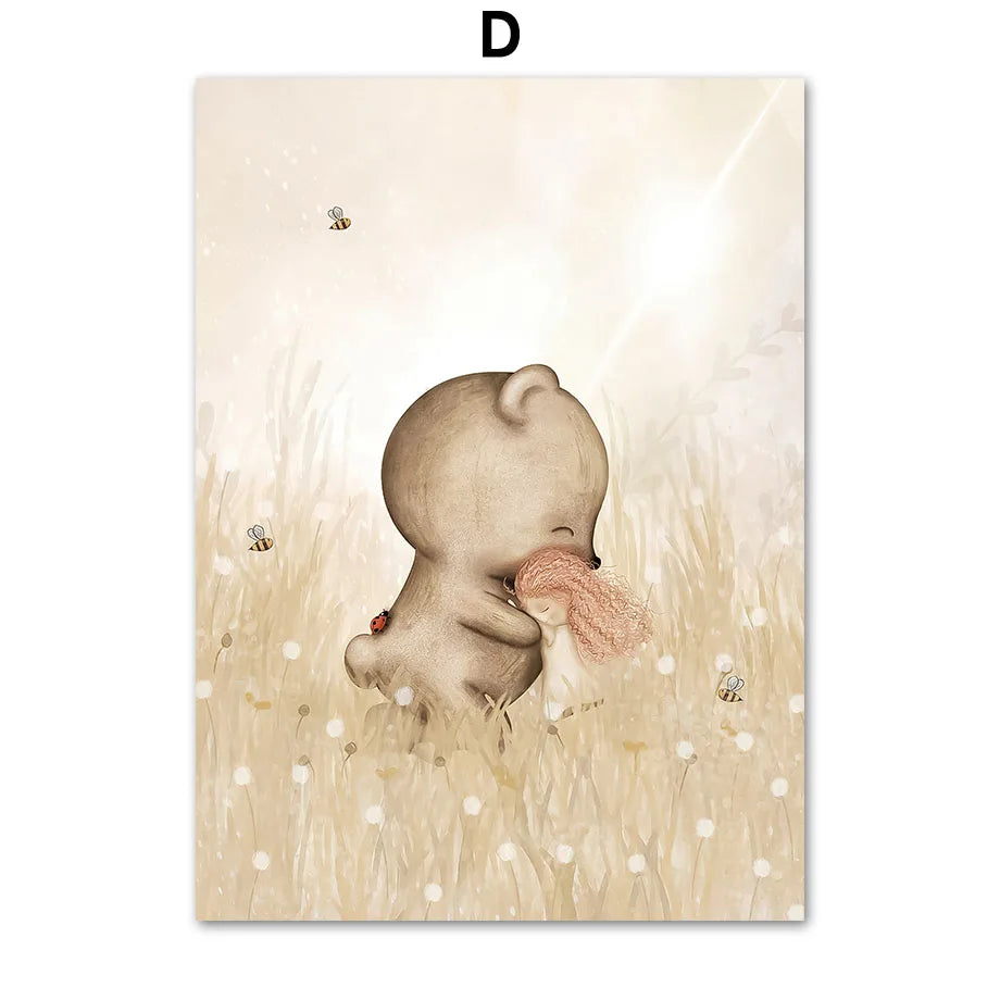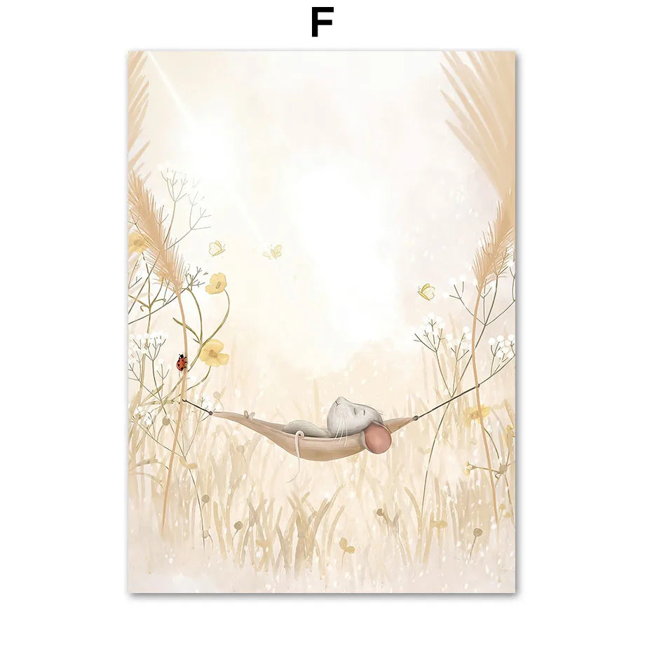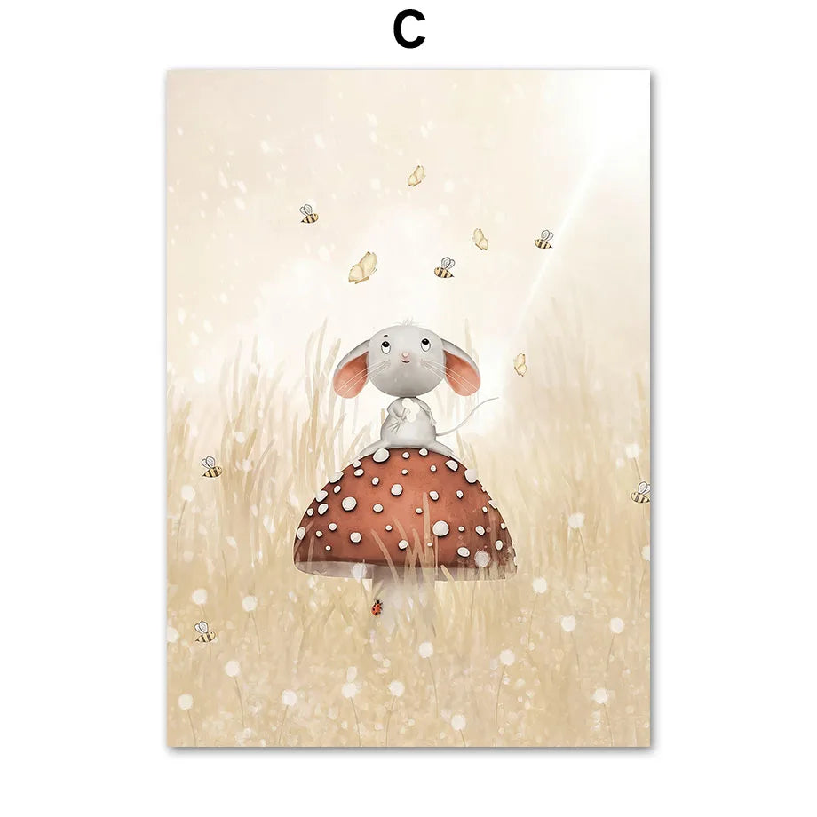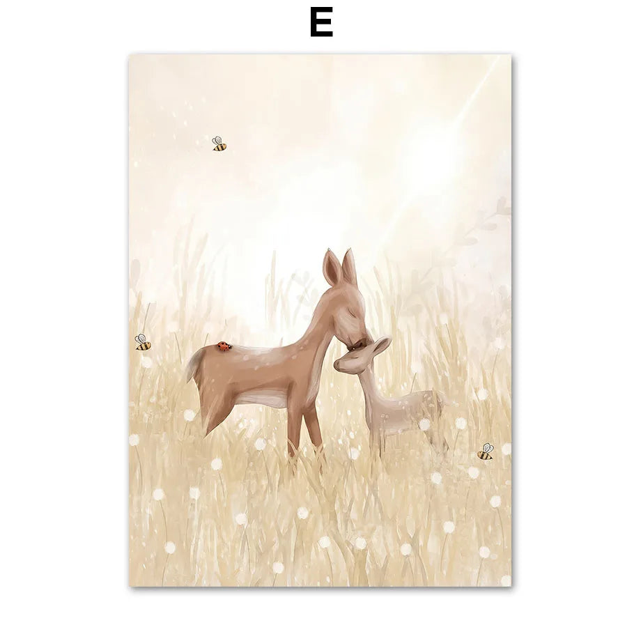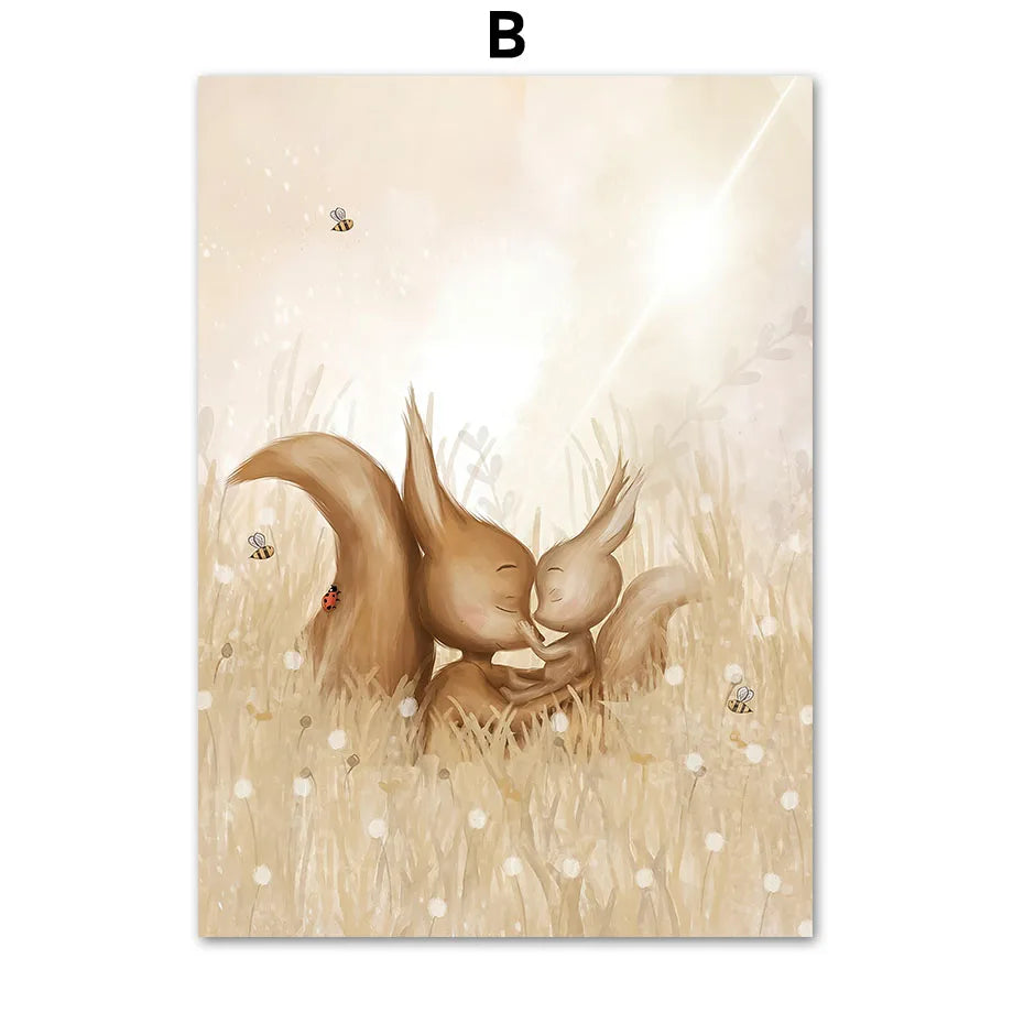 Bring a whimsical touch to your baby's room with the Boho Nursery Wall Art. This charming canvas painting features adorable illustrations of a bear, rabbit, mouse, squirrel, and deer, rendered in a soothing boho style. The Nordic-inspired design adds a cozy and playful atmosphere to any nursery or kids' room. Perfect for creating a serene and imaginative environment, this print will enhance your child's space with its gentle colors and endearing characters.