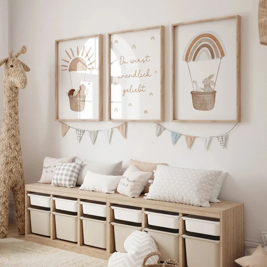 - Enchanting Illustrations: Includes a red balloon, hedgehog, bear, and rabbit in a whimsical boho style.