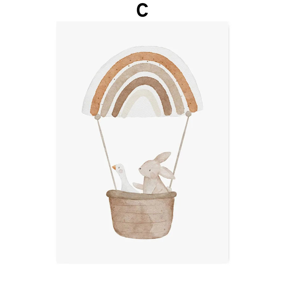 Brighten up your nursery with the Boho Sun Color Red Balloon Wall Art. This captivating canvas painting features a delightful scene with a red balloon, hedgehog, bear, and rabbit, all set against a sunny backdrop. Designed in a charming boho style, this artwork adds a playful and cozy touch to any baby or kids' room. Perfect for creating a joyful and imaginative environment, it enhances your nursery or child's space with its whimsical design and vibrant colors.