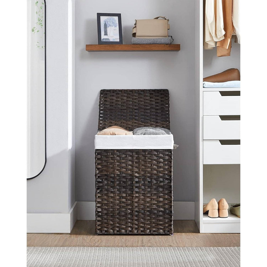 Upgrade your laundry routine with the Brown PP Rattan 24-Gal Laundry Hamper Basket. This spacious hamper features a durable PP rattan construction and comes with a 2-compartment design to help you sort your laundry efficiently. Each compartment is equipped with a washable liner bag for easy cleaning and maintenance. The neutral brown color and rattan texture add a touch of elegance to your space, while the large 24-gallon capacity makes it ideal for families or busy households. Enjoy the added convenience of free shipping on this practical and stylish laundry solution.