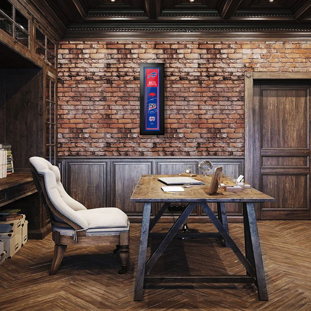 Celebrate your Buffalo Bills fandom with this 6" x 22" framed art print. Featuring the team’s established date and logos through the years on a team-color backdrop with faux matting, it’s perfect for home or office. The black MDF frame with glass front and pre-mounted hooks makes it ready to hang. Officially licensed by the NFL.