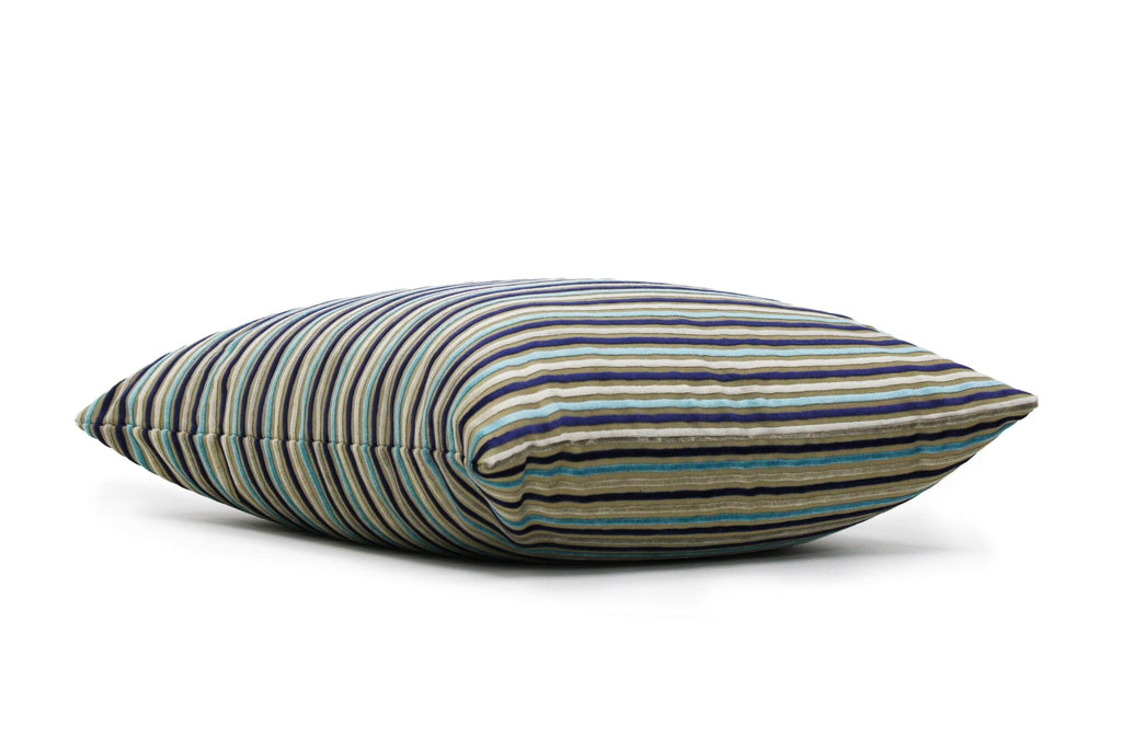 The Cadet Cushion Cover adds nautical elegance and comfort to any sofa, armchair, or bed with its aqua, navy, and silver stripe pattern. Handmade in Canada from a durable blend of 57% polyester and 43% viscose, it offers both style and longevity. The knife edge construction and visible navy zipper with silver teeth provide a polished, secure finish. Perfect for pairing with your favorite cushions, this limited-run cover is available while supplies last. Cushion inserts sold separately.