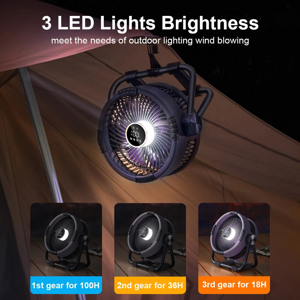 Stay cool and comfortable during your outdoor adventures with the Camping Fan Portable Electric Fan. Featuring a powerful 20,000mAh rechargeable battery, this versatile fan serves as both an air circulator and a portable power bank. Its wireless design and compact size make it perfect for camping trips, picnics, or any outdoor activity where a refreshing breeze is needed. The fan can be used as a desktop or ceiling fan, offering flexibility and convenience wherever you go.