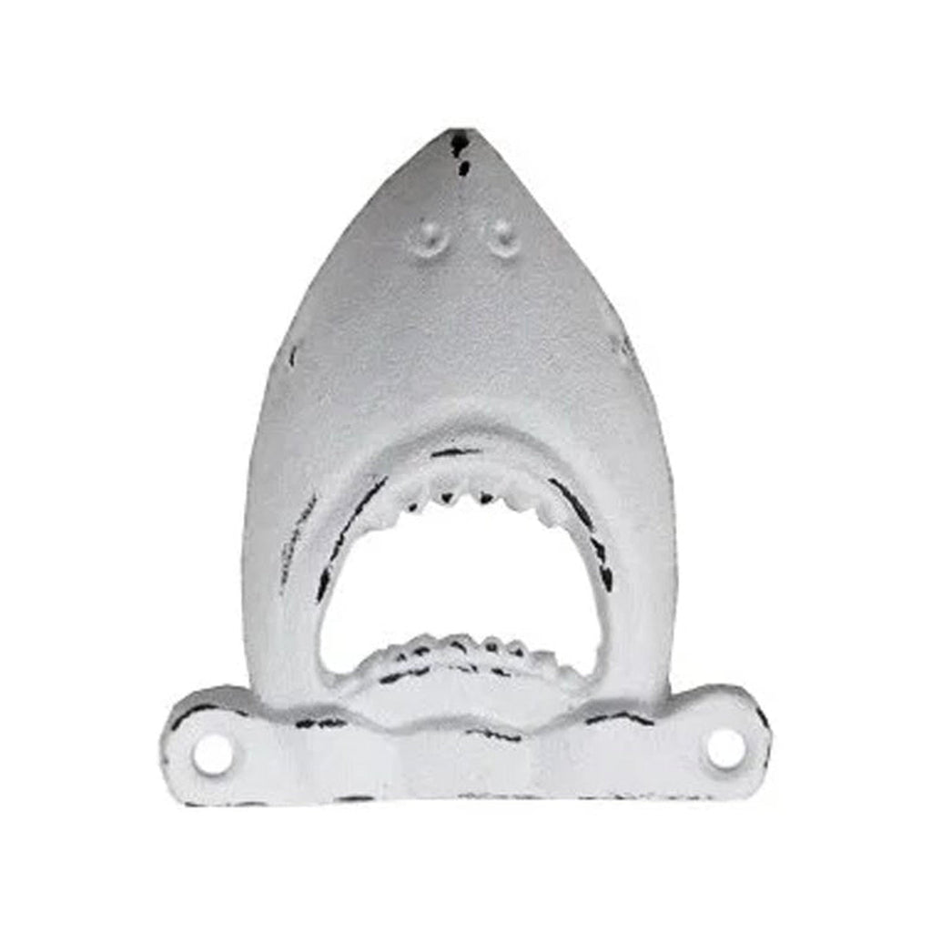 Bring a nautical flair to your kitchen or bar with this Cast Iron Shark Bottle Opener. Made from durable cast iron and finished in antique white, this opener combines functionality with maritime style. Its compact size of 3.3 × 0.9 × 3.5 inches offers a comfortable grip for effortless bottle opening, making it both a practical tool and a decorative piece for any ocean-inspired space.