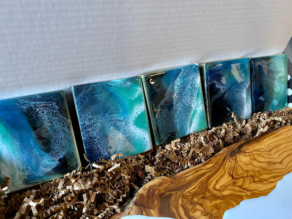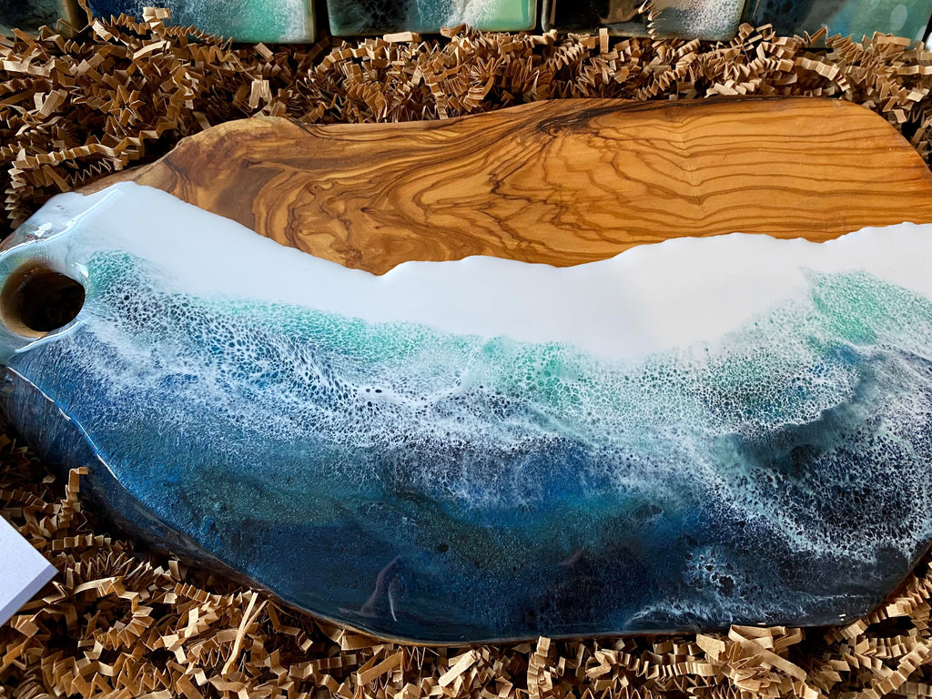 Manufacturer: Olive wood charcuterie board with 5 matching ocean inspired coasters