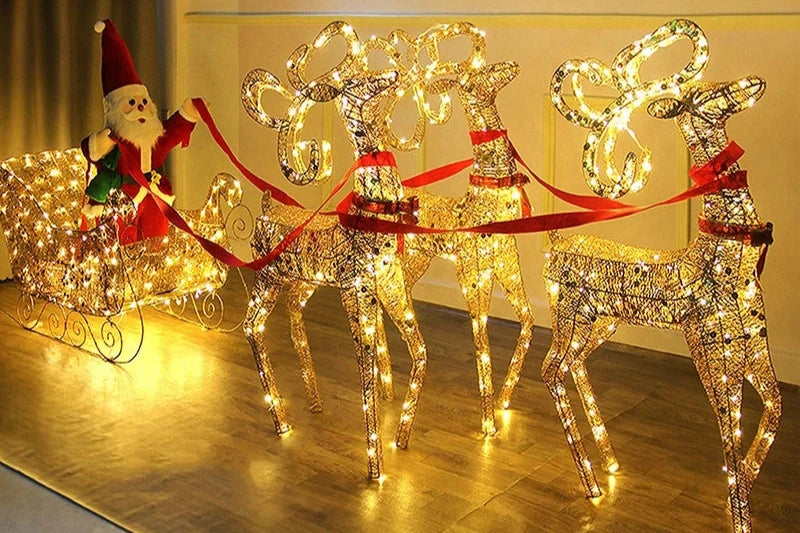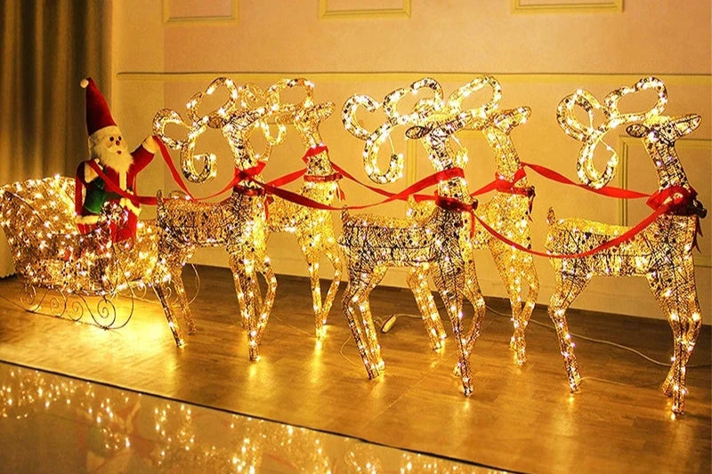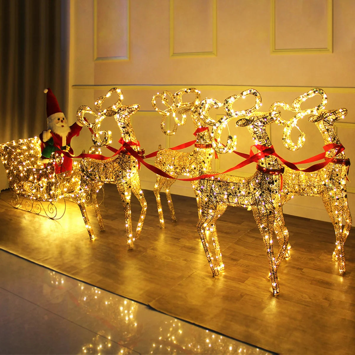 Add a touch of elegance and festive charm to your holiday decor with the Christmas Gold Reindeer Sleigh LED Light Iron Sleigh Cart. This stunning piece combines classic design with modern LED lighting, creating a captivating display for your home, garden, or yard.