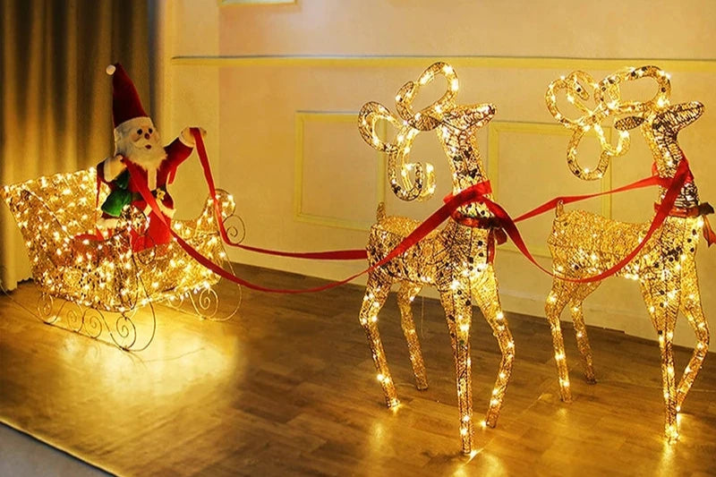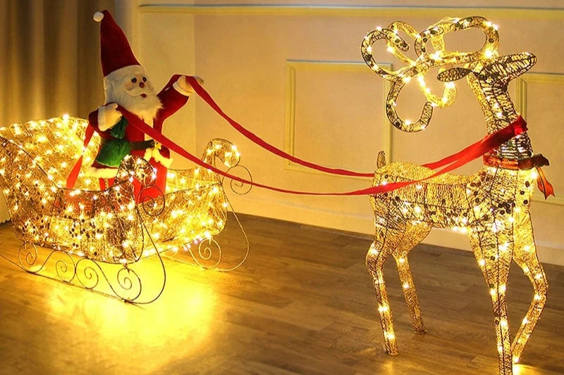 LED Lighting: Adorned with LED lights, the sleigh cart emits a warm, inviting glow that illuminates your holiday setting and adds a magical touch to your decor.