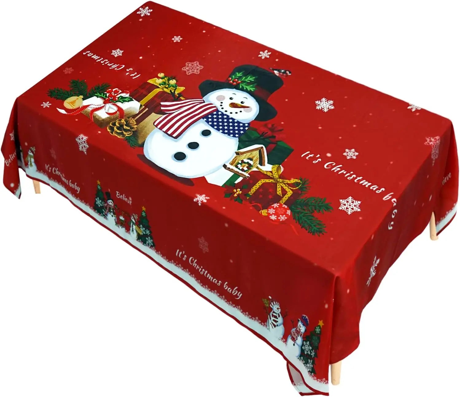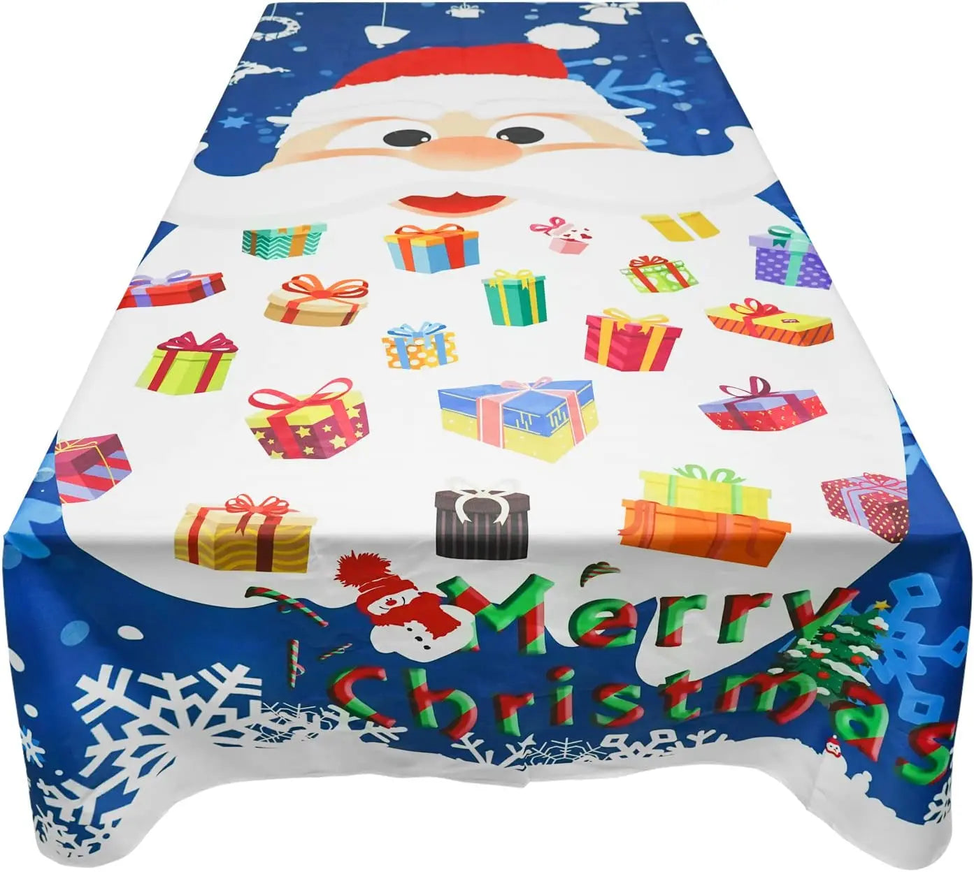 Festive Design: Adorned with a cheerful print of snowflakes, snowmen, and Santa Claus, this tablecloth brings a joyful holiday spirit to your table setting. The vibrant colors and whimsical patterns create a warm and inviting atmosphere.