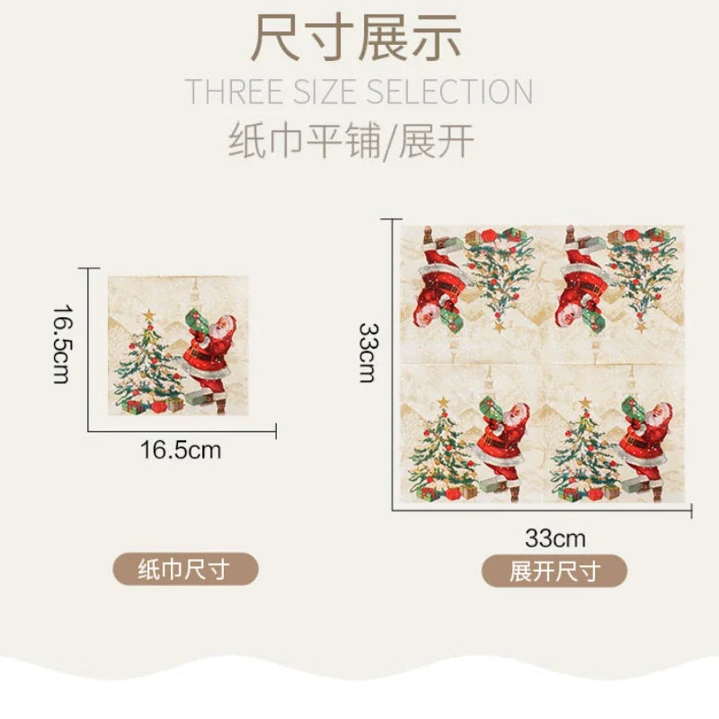 Elevate your holiday dining experience with our Christmas Tree & Santa Claus Printed Napkins. Made from original wood pulp, these 2-ply disposable napkins are designed to add a festive touch to any party, hotel, wedding, or café setting. Featuring cheerful Christmas designs, they are not only practical but also serve as delightful decorative pieces for your table. Perfect for family gatherings, holiday dinners, or festive events, these napkins ensure easy clean-up while enhancing the overall aesthetic of your holiday celebrations.