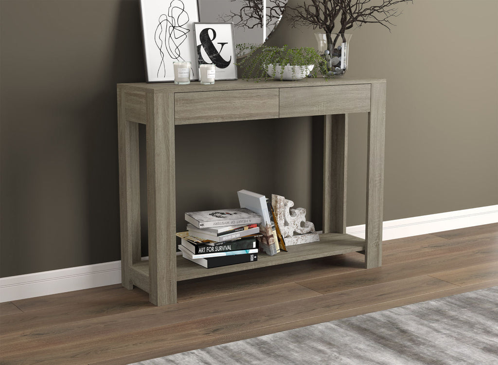 Enhance your home with the Dark Taupe Console Sofa Table. Featuring 2 discreet drawers and 1 spacious shelf, this table combines elegance and practicality. Perfect for entryways, behind sofas, or any living space, it provides storage for essentials while showcasing décor with style.