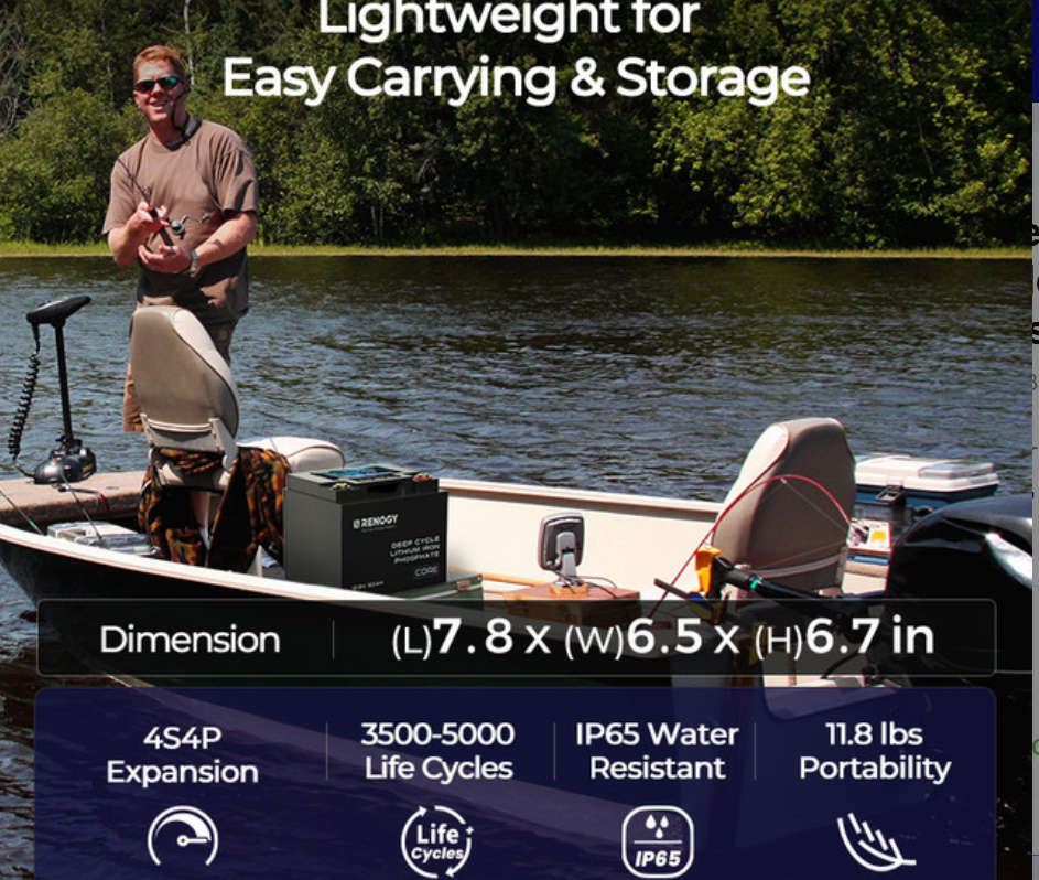 The Renogy Core 12V 50Ah Deep Cycle Lithium Iron Phosphate (LiFePO4) Battery is a compact, high-performance energy solution designed for off-grid adventures, marine applications, and backup power needs. Delivering 640Wh of reliable power, this lightweight battery— weighing just 14.3 lbs, over 50% lighter than comparable lead-acid batteries— is ideal for RVs, camping, trolling motors, and solar systems. Its unibody design ensures durability and easy installation, fitting seamlessly into standard battery boxes.